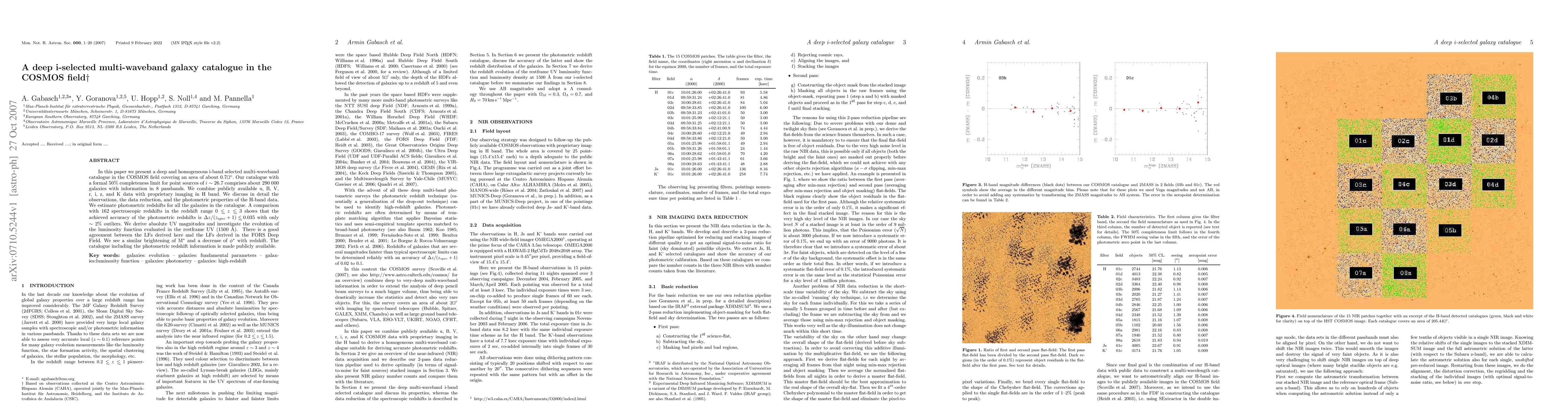 In this paper we present a deep and homogeneous i-band selected multi-waveband catalogue in the COSMOS field covering an area of about 0.7 square-degree. Our catalogue with a formal 50 percent completeness limit for point sources of i~26.7 comprises about 290.000 galaxies with information in 8 passbands. We combine publicly available u, B, V, r, i, z, and K data with proprietary imaging in H band. We discuss in detail the observations, the data reduction, and the photometric properties of the H-band data. We estimate photometric redshifts for all the galaxies in the catalogue. A comparison with 162 spectroscopic redshifts in the redshift range 0 < z < 3 shows that the achieved accuracy of the photometric redshifts is (Delta_z / (z_spec+1)) ~0.035 with only ~2 percent outliers. We derive absolute UV magnitudes and investigate the evolution of the luminosity function evaluated in the rest-frame UV at 1500 Angstrom. There is a good agreement between the LFs derived here and the LFs derived in the FORS Deep Field. We see a similar brightening of M_star and a decrease of phi_star with redshift. The catalogue including the photometric redshift information is made publicly available.
