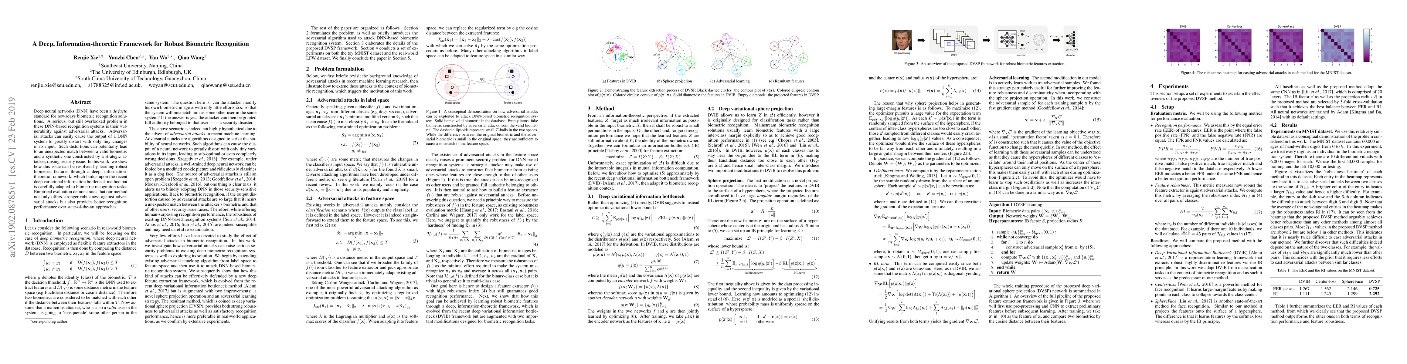 Deep neural networks (DNN) have been a de facto standard for nowadays biometric recognition solutions. A serious, but still overlooked problem in these DNN-based recognition systems is their vulnerability against adversarial attacks. Adversarial attacks can easily cause the output of a DNN system to greatly distort with only tiny changes in its input. Such distortions can potentially lead to an unexpected match between a valid biometric and a synthetic one constructed by a strategic attacker, raising security issue. In this work, we show how this issue can be resolved by learning robust biometric features through a deep, information-theoretic framework, which builds upon the recent deep variational information bottleneck method but is carefully adapted to biometric recognition tasks. Empirical evaluation demonstrates that our method not only offers stronger robustness against adversarial attacks but also provides better recognition performance over state-of-the-art approaches.