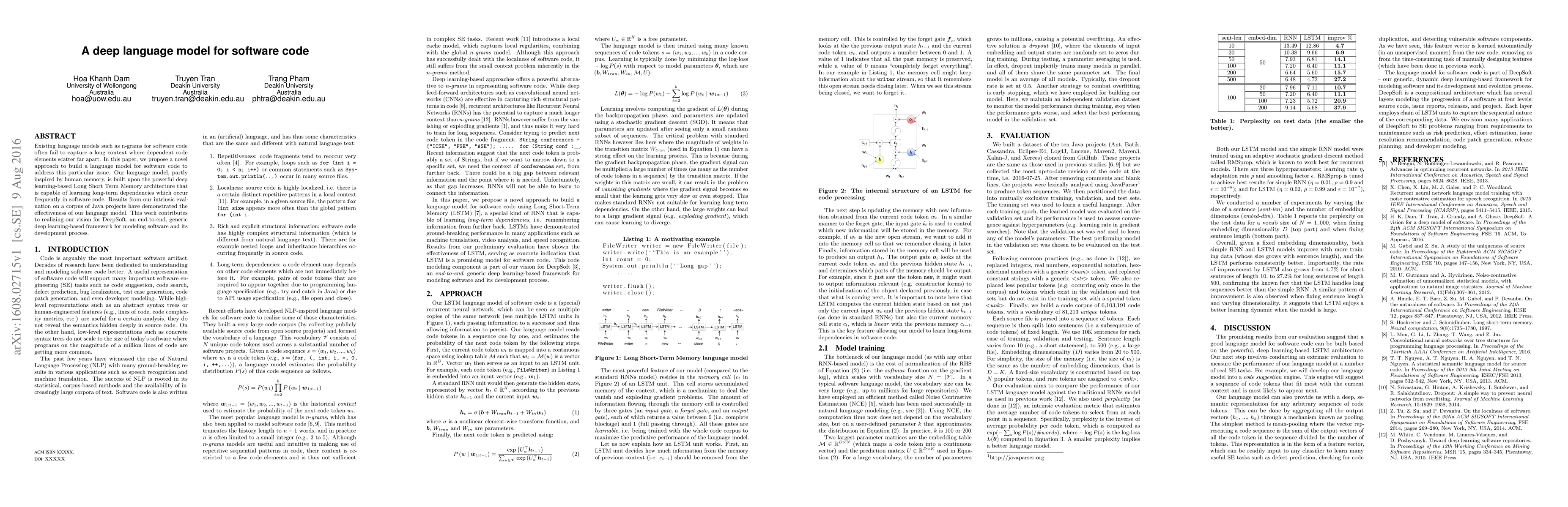 Existing language models such as n-grams for software code often fail to capture a long context where dependent code elements scatter far apart. In this paper, we propose a novel approach to build a language model for software code to address this particular issue. Our language model, partly inspired by human memory, is built upon the powerful deep learning-based Long Short Term Memory architecture that is capable of learning long-term dependencies which occur frequently in software code. Results from our intrinsic evaluation on a corpus of Java projects have demonstrated the effectiveness of our language model. This work contributes to realizing our vision for DeepSoft, an end-to-end, generic deep learning-based framework for modeling software and its development process.