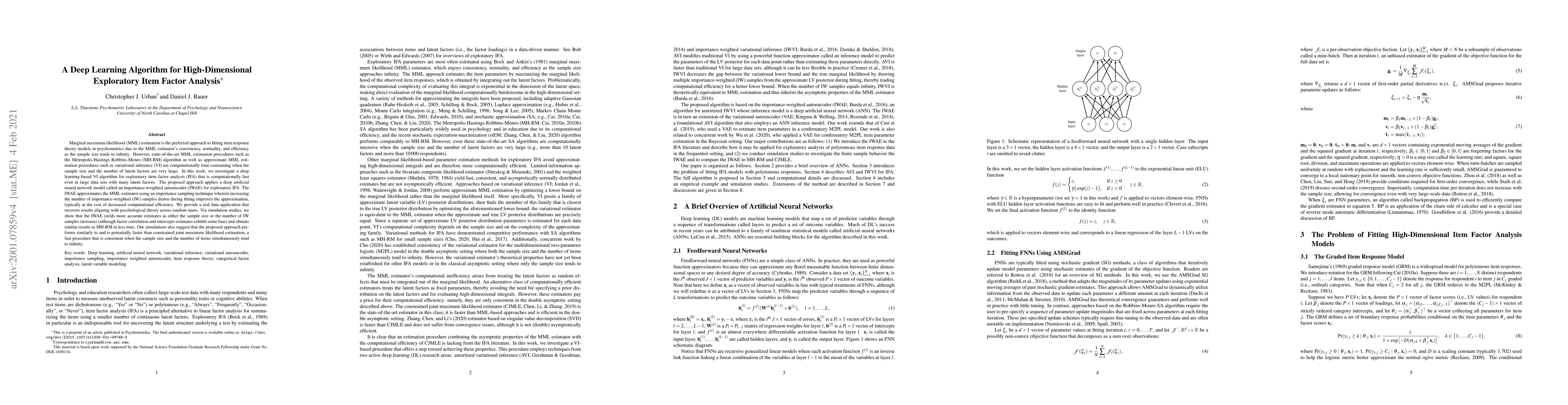 This paper proposes a deep learning-based variational inference algorithm using an importance-weighted autoencoder (IWAE) for fast exploratory item factor analysis (IFA) in high-dimensional settings. The IWAE approximates marginal maximum likelihood estimation efficiently, yielding accurate results in large datasets while significantly reducing computational time compared to traditional methods.