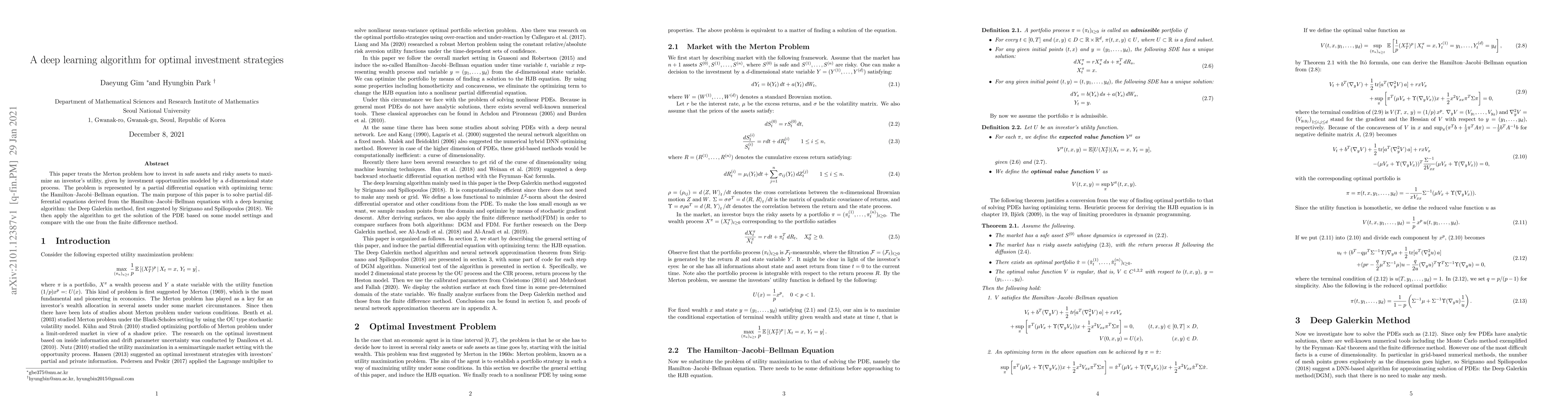 A deep learning algorithm is used to solve a mathematical problem for optimal investment strategies, solving a partial differential equation with high accuracy and compared to traditional finite difference methods.