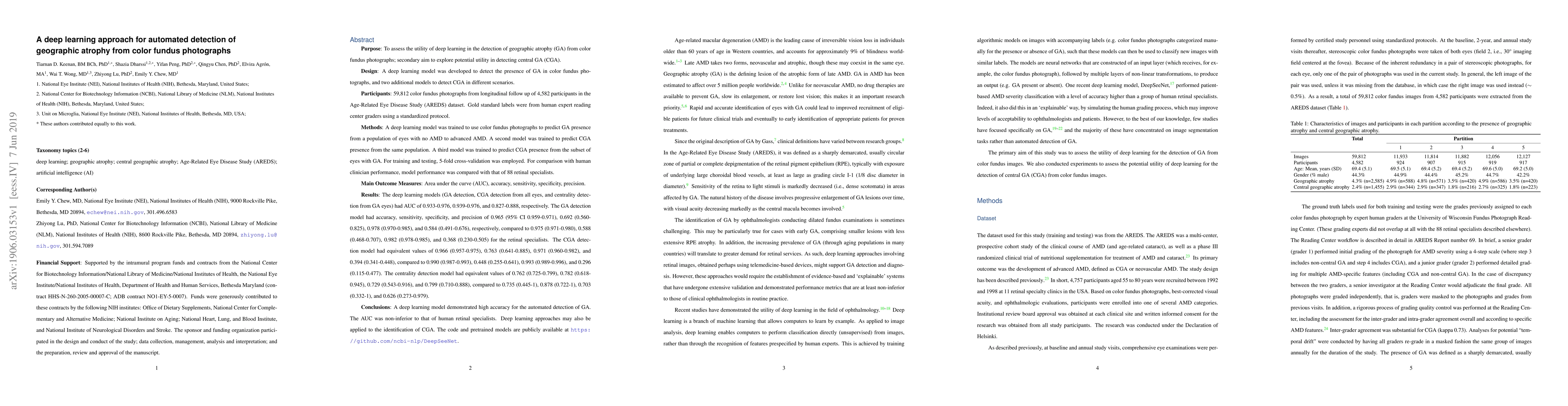 This study developed deep learning models to detect geographic atrophy (GA) and central GA (CGA) from color fundus photographs, achieving high accuracy and AUC values comparable to human retinal specialists. The pretrained models are publicly available for further research.