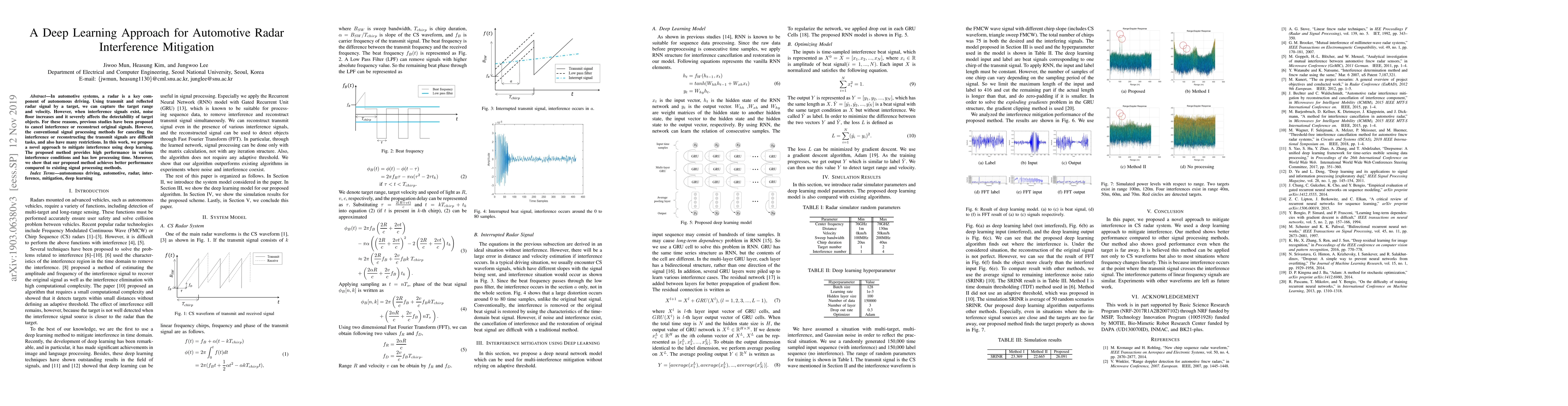 This paper proposes a deep learning approach to mitigate automotive radar interference, achieving superior performance and lower processing times compared to traditional signal processing methods, thereby enhancing the detectability of target objects in the presence of noise.