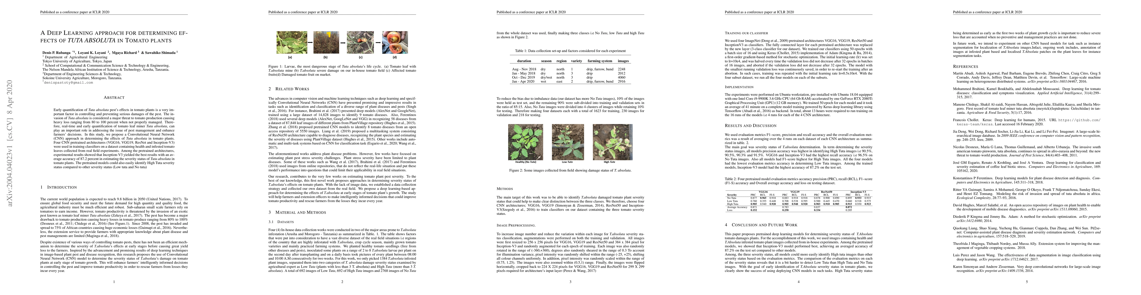 Early quantification of Tuta absoluta pest's effects in tomato plants is a very important factor in controlling and preventing serious damages of the pest. The invasion of Tuta absoluta is considered a major threat to tomato production causing heavy loss ranging from 80 to 100 percent when not properly managed. Therefore, real-time and early quantification of tomato leaf miner Tuta absoluta, can play an important role in addressing the issue of pest management and enhance farmers' decisions. In this study, we propose a Convolutional Neural Network (CNN) approach in determining the effects of Tuta absoluta in tomato plants. Four CNN pre-trained architectures (VGG16, VGG19, ResNet and Inception-V3) were used in training classifiers on a dataset containing health and infested tomato leaves collected from real field experiments. Among the pre-trained architectures, experimental results showed that Inception-V3 yielded the best results with an average accuracy of 87.2 percent in estimating the severity status of Tuta absoluta in tomato plants. The pre-trained models could also easily identify High Tuta severity status compared to other severity status (Low tuta and No tuta)