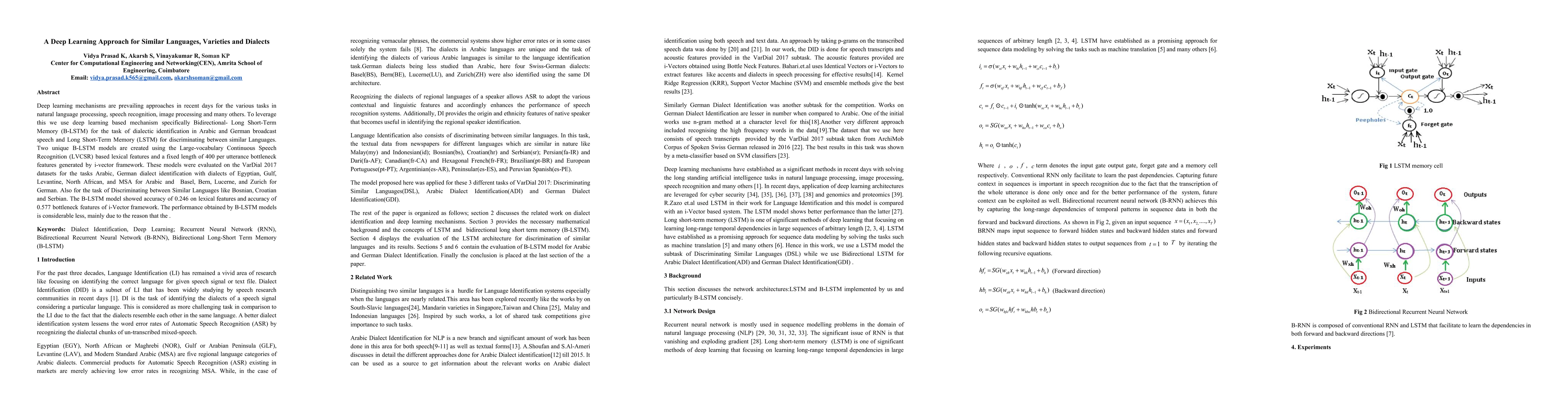 Deep learning mechanisms are prevailing approaches in recent days for the various tasks in natural language processing, speech recognition, image processing and many others. To leverage this we use deep learning based mechanism specifically Bidirectional- Long Short-Term Memory (B-LSTM) for the task of dialectic identification in Arabic and German broadcast speech and Long Short-Term Memory (LSTM) for discriminating between similar Languages. Two unique B-LSTM models are created using the Large-vocabulary Continuous Speech Recognition (LVCSR) based lexical features and a fixed length of 400 per utterance bottleneck features generated by i-vector framework. These models were evaluated on the VarDial 2017 datasets for the tasks Arabic, German dialect identification with dialects of Egyptian, Gulf, Levantine, North African, and MSA for Arabic and Basel, Bern, Lucerne, and Zurich for German. Also for the task of Discriminating between Similar Languages like Bosnian, Croatian and Serbian. The B-LSTM model showed accuracy of 0.246 on lexical features and accuracy of 0.577 bottleneck features of i-Vector framework.