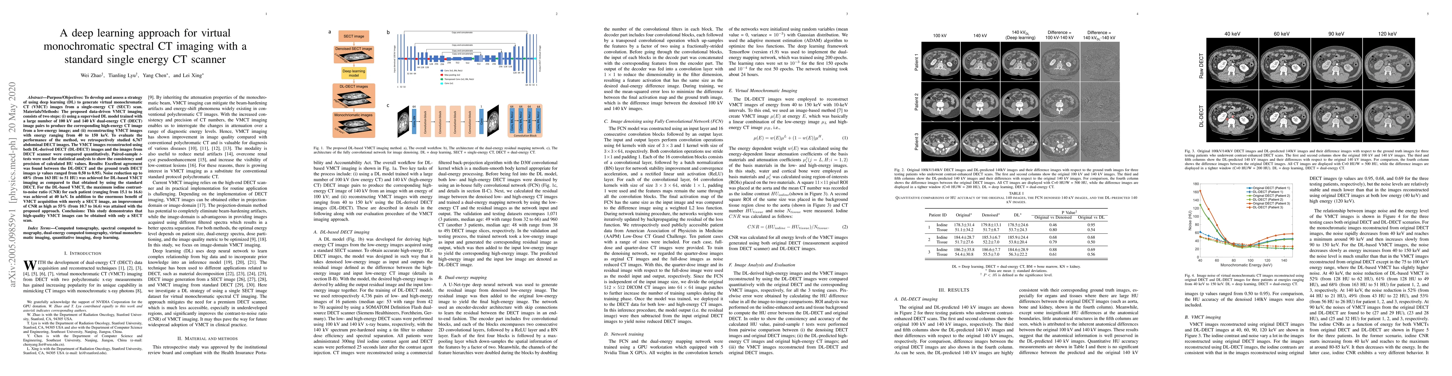 This study developed a deep learning approach to generate virtual monochromatic CT images from a single-energy CT scan, achieving excellent agreement with dual-energy CT ground truth and significant noise reduction and contrast improvement.