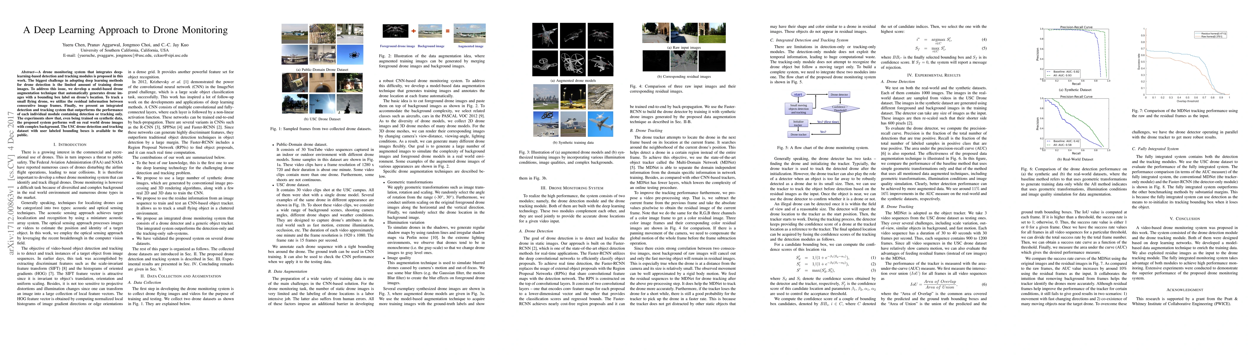 This paper proposes a deep learning system for drone monitoring that combines detection and tracking modules. To overcome the scarcity of training drone images, the authors develop a drone augmentation technique that generates synthetic labeled images, which, when combined with residual information from consecutive frames, enables effective drone tracking. The integrated system outperforms standalone detection or tracking modules and performs well on real-world images.