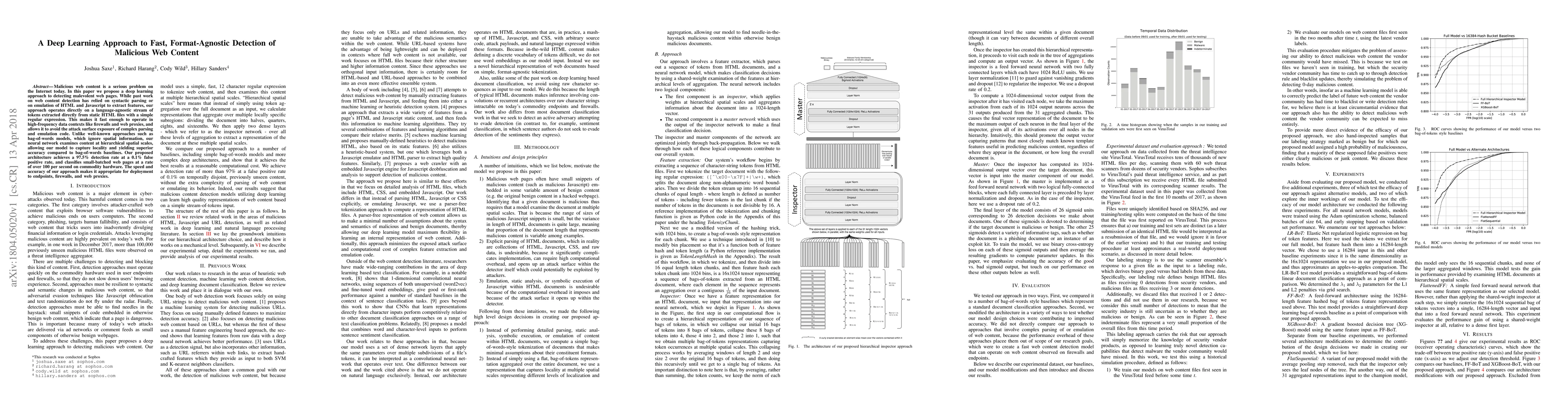 Malicious web content is a serious problem on the Internet today. In this paper we propose a deep learning approach to detecting malevolent web pages. While past work on web content detection has relied on syntactic parsing or on emulation of HTML and Javascript to extract features, our approach operates directly on a language-agnostic stream of tokens extracted directly from static HTML files with a simple regular expression. This makes it fast enough to operate in high-frequency data contexts like firewalls and web proxies, and allows it to avoid the attack surface exposure of complex parsing and emulation code. Unlike well-known approaches such as bag-of-words models, which ignore spatial information, our neural network examines content at hierarchical spatial scales, allowing our model to capture locality and yielding superior accuracy compared to bag-of-words baselines. Our proposed architecture achieves a 97.5% detection rate at a 0.1% false positive rate, and classifies small-batched web pages at a rate of over 100 per second on commodity hardware. The speed and accuracy of our approach makes it appropriate for deployment to endpoints, firewalls, and web proxies.