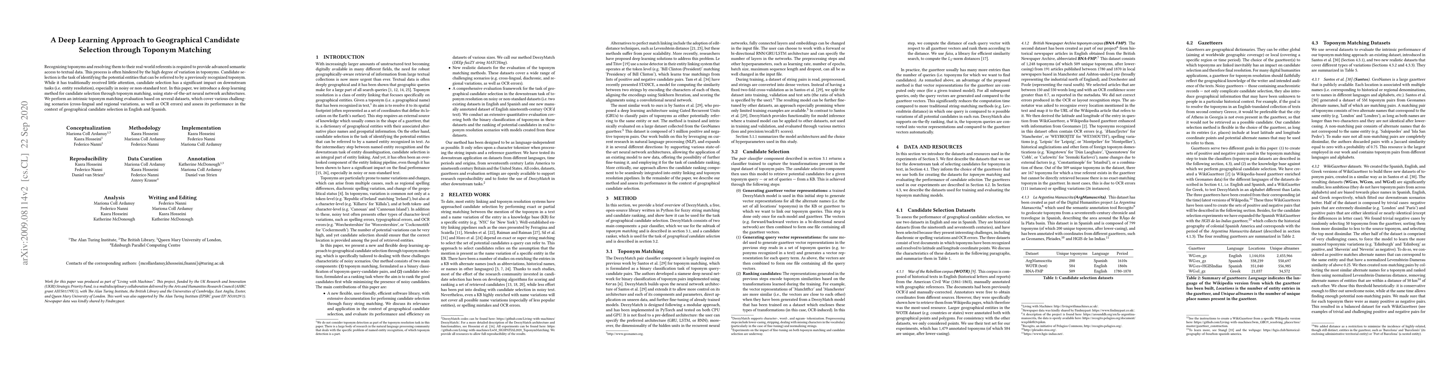A new deep learning approach is introduced to improve geographical candidate selection through toponym matching, with promising results on various challenging datasets.