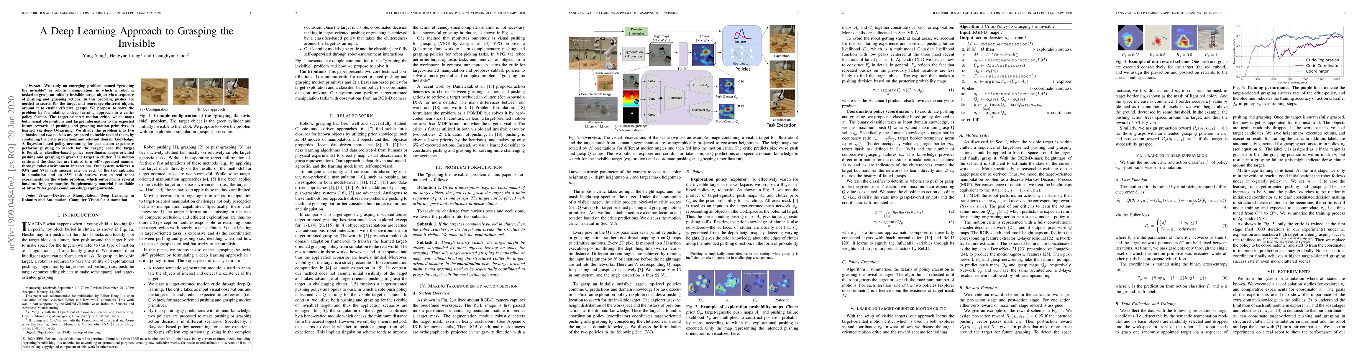 This paper proposes a deep learning approach to solve the "grasping the invisible" problem in robotic manipulation, where a robot must find and grasp an initially unseen target by pushing and rearranging objects. The method uses a critic-policy framework with deep Q-learning to learn a target-oriented motion critic and two specialized policies for searching and grasping, achieving high success rates in both simulation and real-world experiments.