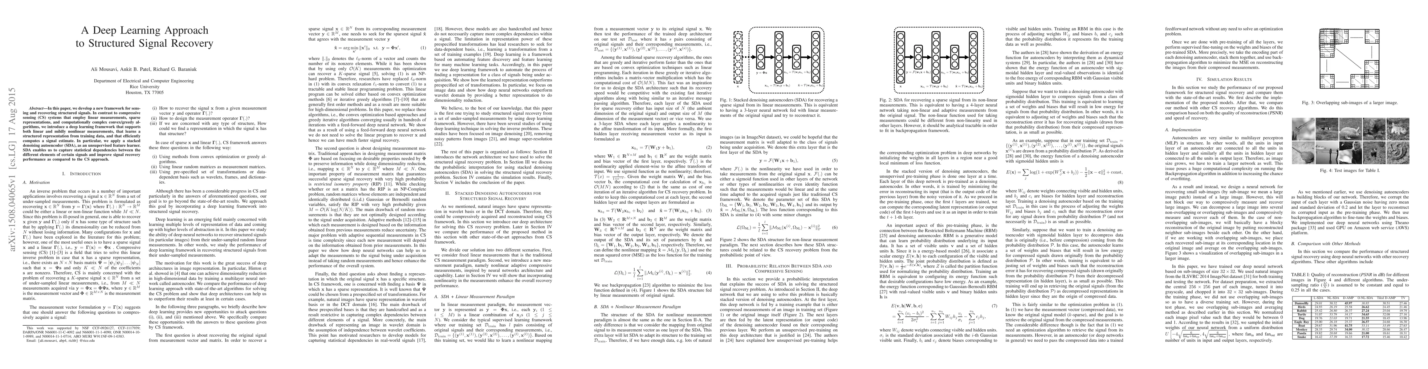 This paper proposes a deep learning framework for structured signal recovery using a stacked denoising autoencoder (SDA) to learn signal representations and improve recovery performance over traditional compressive sensing methods. The approach efficiently handles both linear and mildly nonlinear measurements.