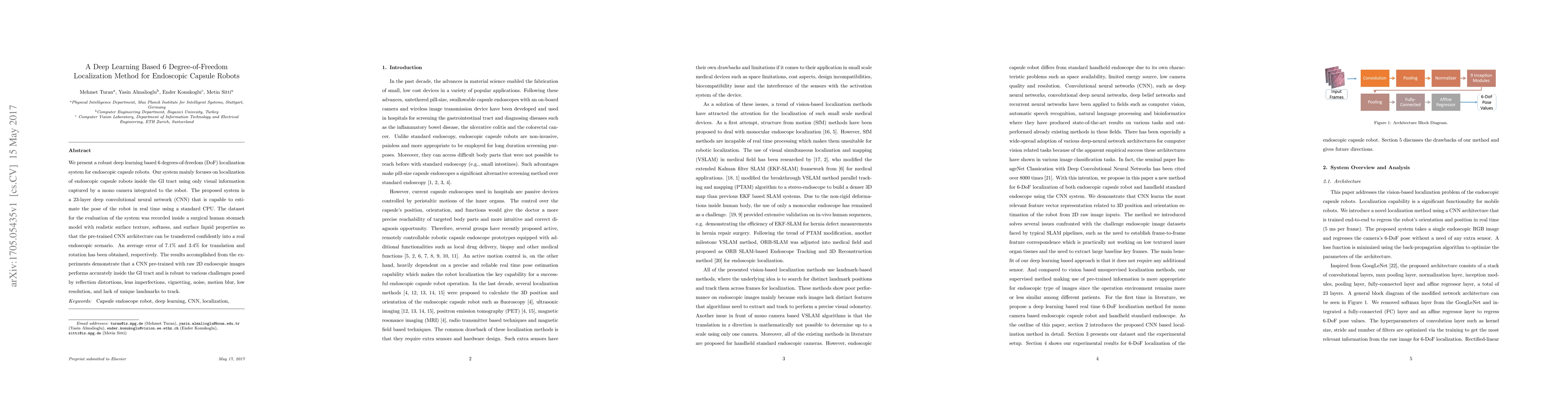 This paper proposes a deep learning-based 6 DoF localization system for endoscopic capsule robots using a 23-layer CNN, achieving an average error of 7.1% for translation and 3.4% for rotation, demonstrating robustness against various image distortions. The system is evaluated using a realistic surgical human stomach model.