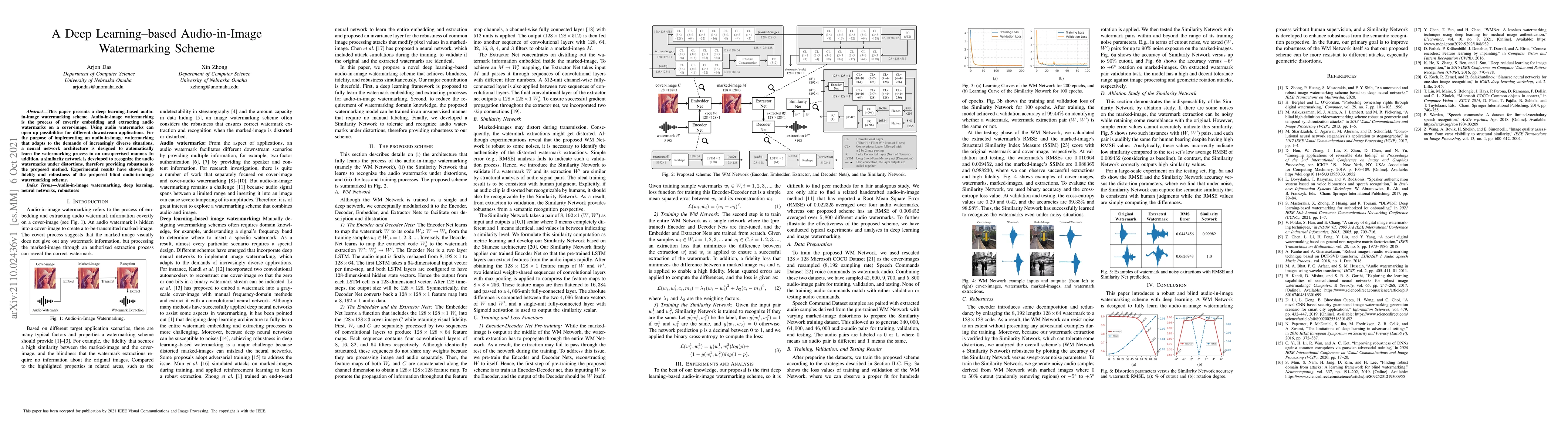 This research proposes a deep learning-based method for embedding and extracting audio watermarks within images, utilizing a neural network to learn the process unsupervised and a similarity network for robustness against distortions, demonstrating high fidelity and robustness in experiments.
