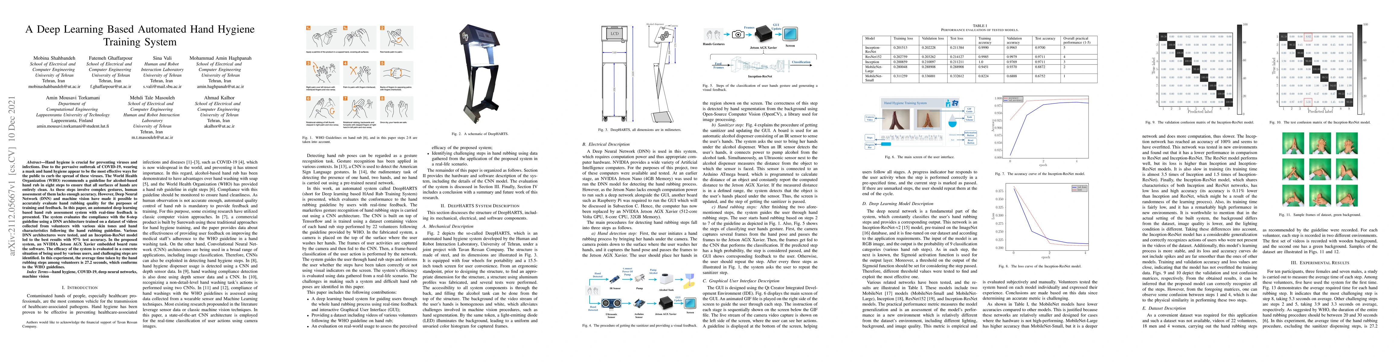 Hand hygiene is crucial for preventing viruses and infections. Due to the pervasive outbreak of COVID-19, wearing a mask and hand hygiene appear to be the most effective ways for the public to curb the spread of these viruses. The World Health Organization (WHO) recommends a guideline for alcohol-based hand rub in eight steps to ensure that all surfaces of hands are entirely clean. As these steps involve complex gestures, human assessment of them lacks enough accuracy. However, Deep Neural Network (DNN) and machine vision have made it possible to accurately evaluate hand rubbing quality for the purposes of training and feedback. In this paper, an automated deep learning based hand rub assessment system with real-time feedback is presented. The system evaluates the compliance with the 8-step guideline using a DNN architecture trained on a dataset of videos collected from volunteers with various skin tones and hand characteristics following the hand rubbing guideline. Various DNN architectures were tested, and an Inception-ResNet model led to the best results with 97% test accuracy. In the proposed system, an NVIDIA Jetson AGX Xavier embedded board runs the software. The efficacy of the system is evaluated in a concrete situation of being used by various users, and challenging steps are identified. In this experiment, the average time taken by the hand rubbing steps among volunteers is 27.2 seconds, which conforms to the WHO guidelines.
