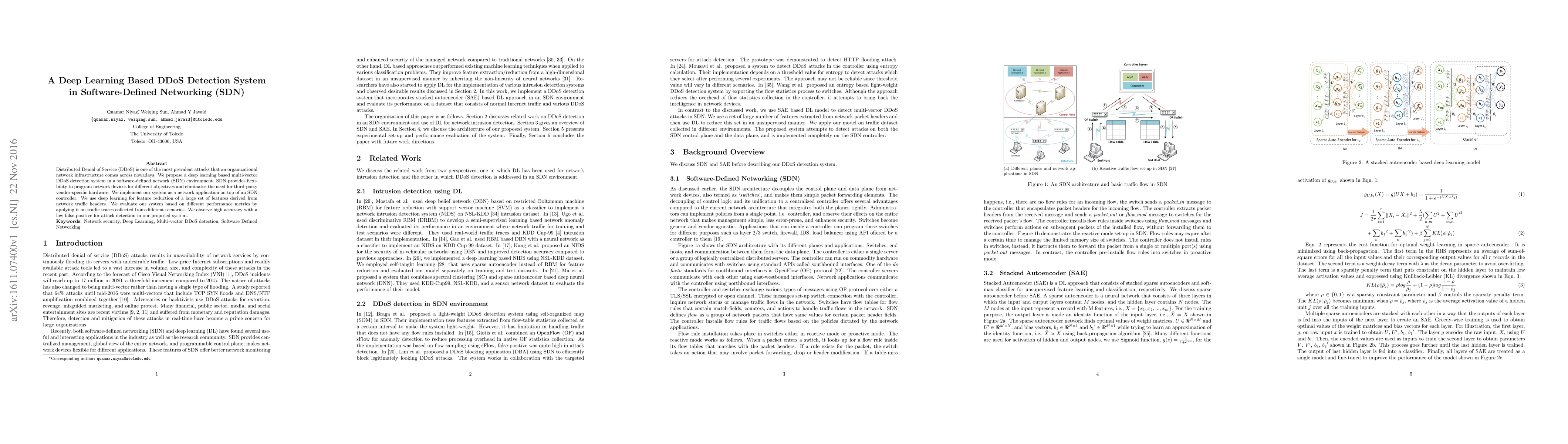 This paper proposes a deep learning-based DDoS detection system implemented in a software-defined networking environment, leveraging deep learning for feature reduction from network traffic headers. The system demonstrates high accuracy and low false-positive rates in detecting DDoS attacks, evaluated through various performance metrics using real traffic traces.
