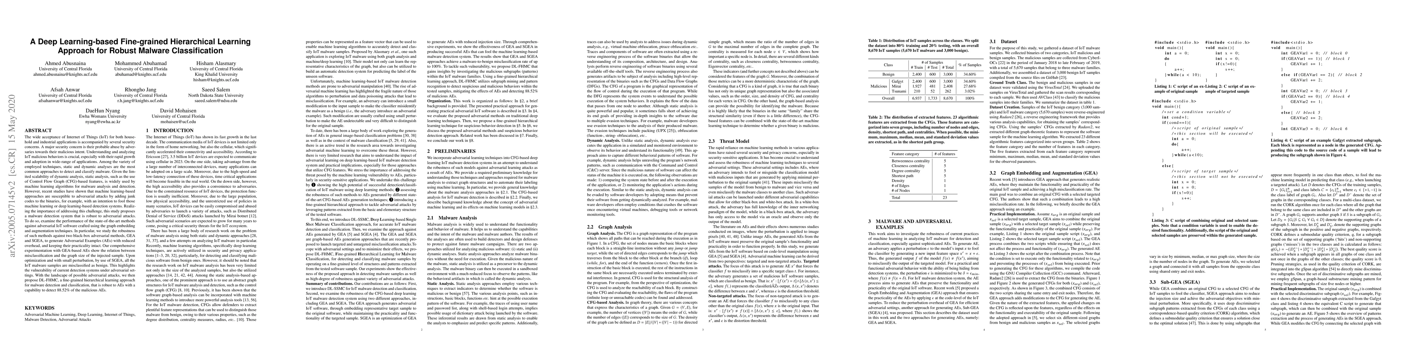 The wide acceptance of Internet of Things (IoT) for both household and industrial applications is accompanied by several security concerns. A major security concern is their probable abuse by adversaries towards their malicious intent. Understanding and analyzing IoT malicious behaviors is crucial, especially with their rapid growth and adoption in wide-range of applications. However, recent studies have shown that machine learning-based approaches are susceptible to adversarial attacks by adding junk codes to the binaries, for example, with an intention to fool those machine learning or deep learning-based detection systems. Realizing the importance of addressing this challenge, this study proposes a malware detection system that is robust to adversarial attacks. To do so, examine the performance of the state-of-the-art methods against adversarial IoT software crafted using the graph embedding and augmentation techniques. In particular, we study the robustness of such methods against two black-box adversarial methods, GEA and SGEA, to generate Adversarial Examples (AEs) with reduced overhead, and keeping their practicality intact. Our comprehensive experimentation with GEA-based AEs show the relation between misclassification and the graph size of the injected sample. Upon optimization and with small perturbation, by use of SGEA, all the IoT malware samples are misclassified as benign. This highlights the vulnerability of current detection systems under adversarial settings. With the landscape of possible adversarial attacks, we then propose DL-FHMC, a fine-grained hierarchical learning approach for malware detection and classification, that is robust to AEs with a capability to detect 88.52% of the malicious AEs.