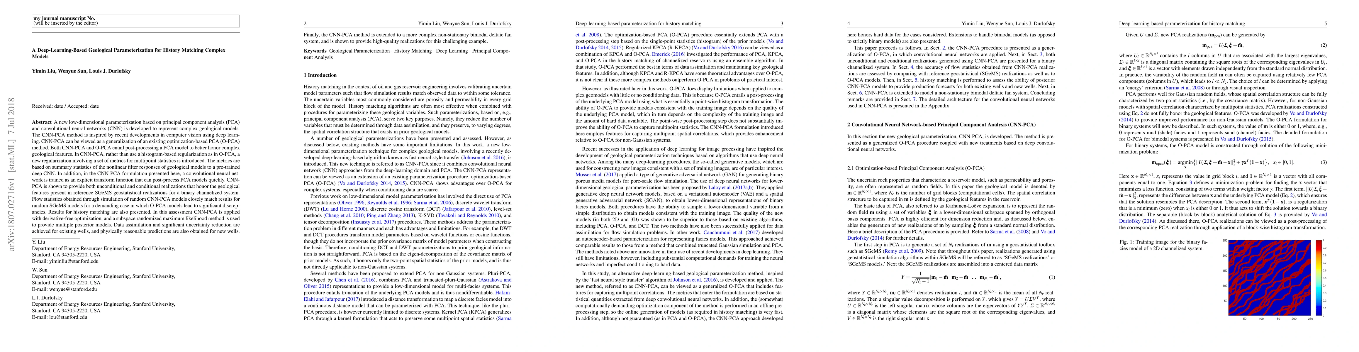 This paper introduces a CNN-PCA method for geological parameterization, combining PCA and convolutional neural networks to represent complex geological models. The method provides accurate realizations and effective history matching, achieving data assimilation and uncertainty reduction for both binary and non-stationary systems.
