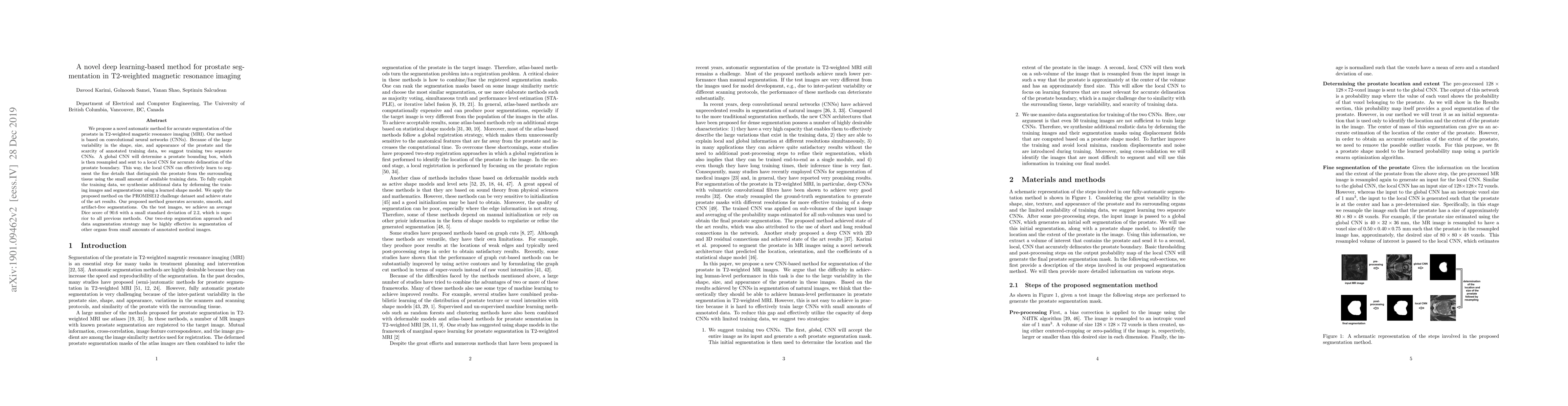This paper proposes a deep learning method using convolutional neural networks (CNNs) for accurate prostate segmentation in T2-weighted MRI, employing a two-step approach with global and local CNNs and data augmentation to achieve state-of-the-art results with an average Dice score of 90.6.