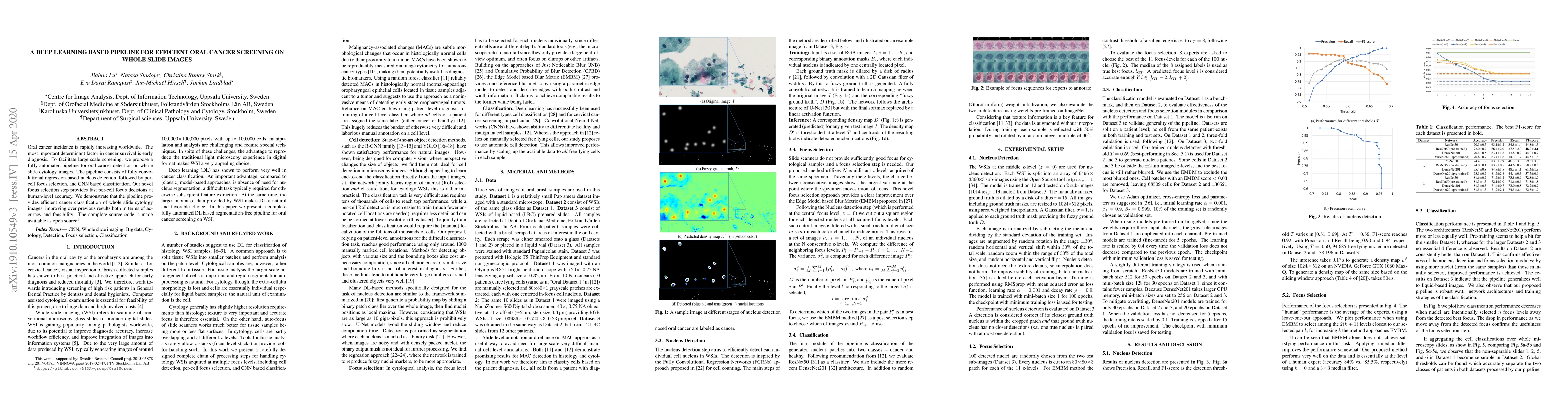 This paper proposes a fully automated deep learning pipeline for efficient oral cancer screening using whole slide imaging, featuring nucleus detection, per-cell focus selection, and CNN classification. The focus selection step achieves human-level accuracy, significantly improving accuracy and feasibility over previous methods.