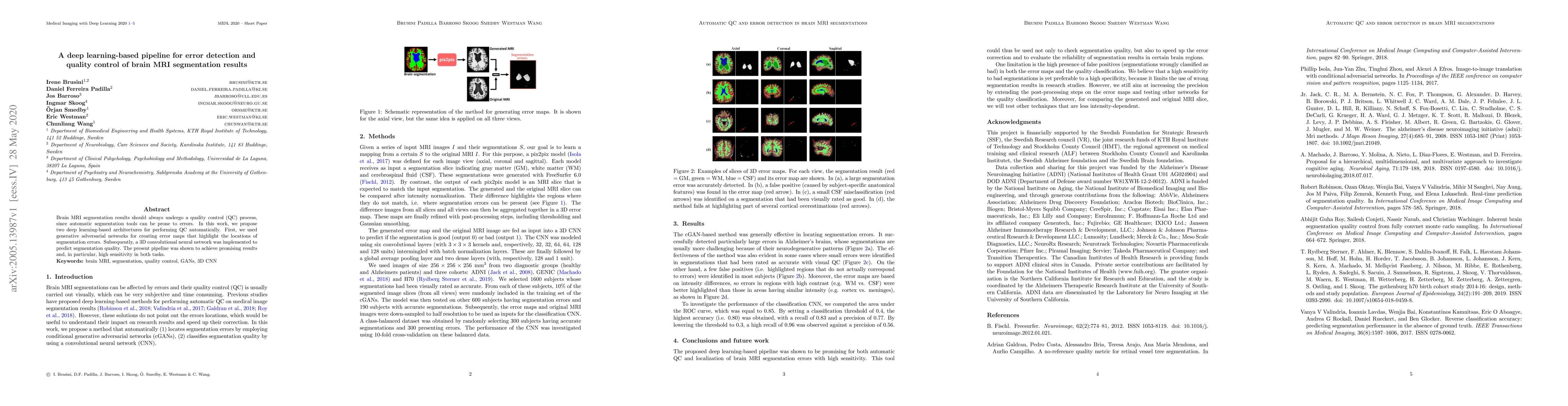 Brain MRI segmentation results should always undergo a quality control (QC) process, since automatic segmentation tools can be prone to errors. In this work, we propose two deep learning-based architectures for performing QC automatically. First, we used generative adversarial networks for creating error maps that highlight the locations of segmentation errors. Subsequently, a 3D convolutional neural network was implemented to predict segmentation quality. The present pipeline was shown to achieve promising results and, in particular, high sensitivity in both tasks.