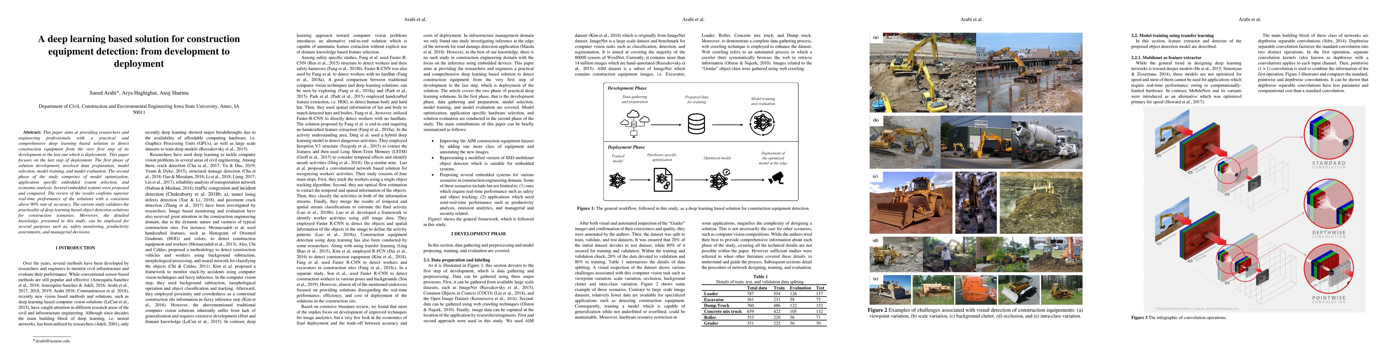 This paper aims at providing researchers and engineering professionals with a practical and comprehensive deep learning based solution to detect construction equipment from the very first step of its development to the last one which is deployment. This paper focuses on the last step of deployment. The first phase of solution development, involved data preparation, model selection, model training, and model evaluation. The second phase of the study comprises of model optimization, application specific embedded system selection, and economic analysis. Several embedded systems were proposed and compared. The review of the results confirms superior real-time performance of the solutions with a consistent above 90% rate of accuracy. The current study validates the practicality of deep learning based object detection solutions for construction scenarios. Moreover, the detailed knowledge, presented in this study, can be employed for several purposes such as, safety monitoring, productivity assessments, and managerial decisions.