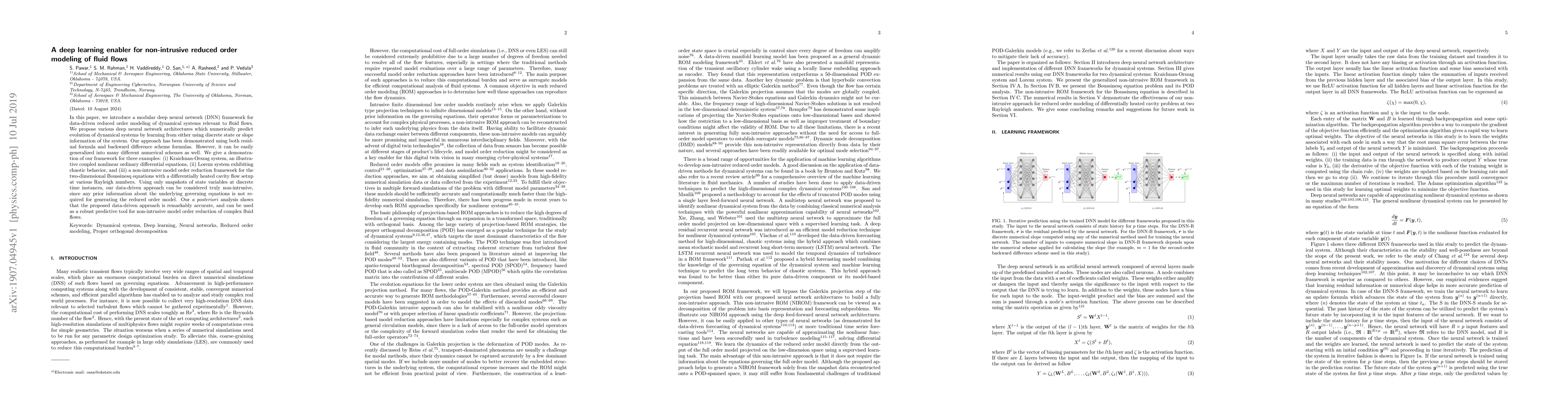 This paper presents a modular deep neural network framework for data-driven reduced order modeling of fluid flows, demonstrating its accuracy and robustness through various examples including the Kraichnan-Orszag system, Lorenz system, and Boussinesq equations. The approach is non-intrusive, relying solely on state variable snapshots without requiring prior knowledge of governing equations.