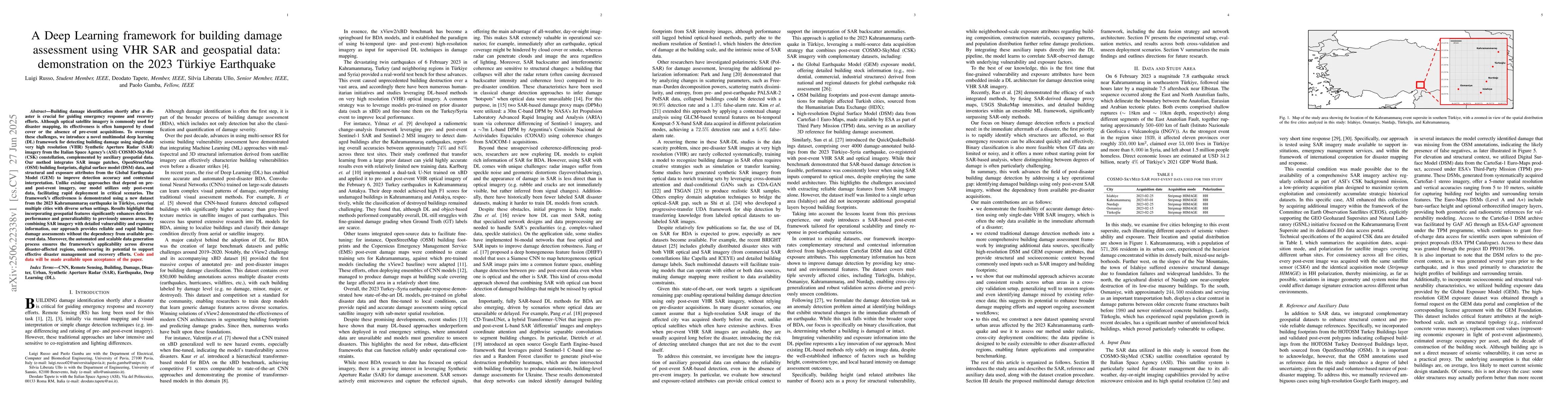 Building damage identification shortly after a disaster is crucial for guiding emergency response and recovery efforts. Although optical satellite imagery is commonly used for disaster mapping, its effectiveness is often hampered by cloud cover or the absence of pre-event acquisitions. To overcome these challenges, we introduce a novel multimodal deep learning (DL) framework for detecting building damage using single-date very high resolution (VHR) Synthetic Aperture Radar (SAR) imagery from the Italian Space Agency (ASI) COSMO SkyMed (CSK) constellation, complemented by auxiliary geospatial data. Our method integrates SAR image patches, OpenStreetMap (OSM) building footprints, digital surface model (DSM) data, and structural and exposure attributes from the Global Earthquake Model (GEM) to improve detection accuracy and contextual interpretation. Unlike existing approaches that depend on pre and post event imagery, our model utilizes only post event data, facilitating rapid deployment in critical scenarios. The framework effectiveness is demonstrated using a new dataset from the 2023 earthquake in Turkey, covering multiple cities with diverse urban settings. Results highlight that incorporating geospatial features significantly enhances detection performance and generalizability to previously unseen areas. By combining SAR imagery with detailed vulnerability and exposure information, our approach provides reliable and rapid building damage assessments without the dependency from available pre-event data. Moreover, the automated and scalable data generation process ensures the framework's applicability across diverse disaster-affected regions, underscoring its potential to support effective disaster management and recovery efforts. Code and data will be made available upon acceptance of the paper.