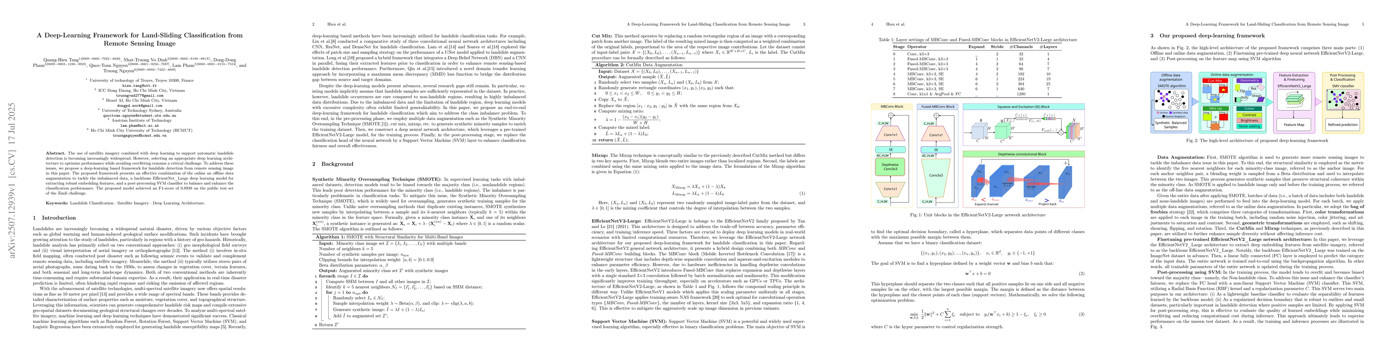 The use of satellite imagery combined with deep learning to support automatic landslide detection is becoming increasingly widespread. However, selecting an appropriate deep learning architecture to optimize performance while avoiding overfitting remains a critical challenge. To address these issues, we propose a deep-learning based framework for landslide detection from remote sensing image in this paper. The proposed framework presents an effective combination of the online an offline data augmentation to tackle the imbalanced data, a backbone EfficientNet\_Large deep learning model for extracting robust embedding features, and a post-processing SVM classifier to balance and enhance the classification performance. The proposed model achieved an F1-score of 0.8938 on the public test set of the Zindi challenge.