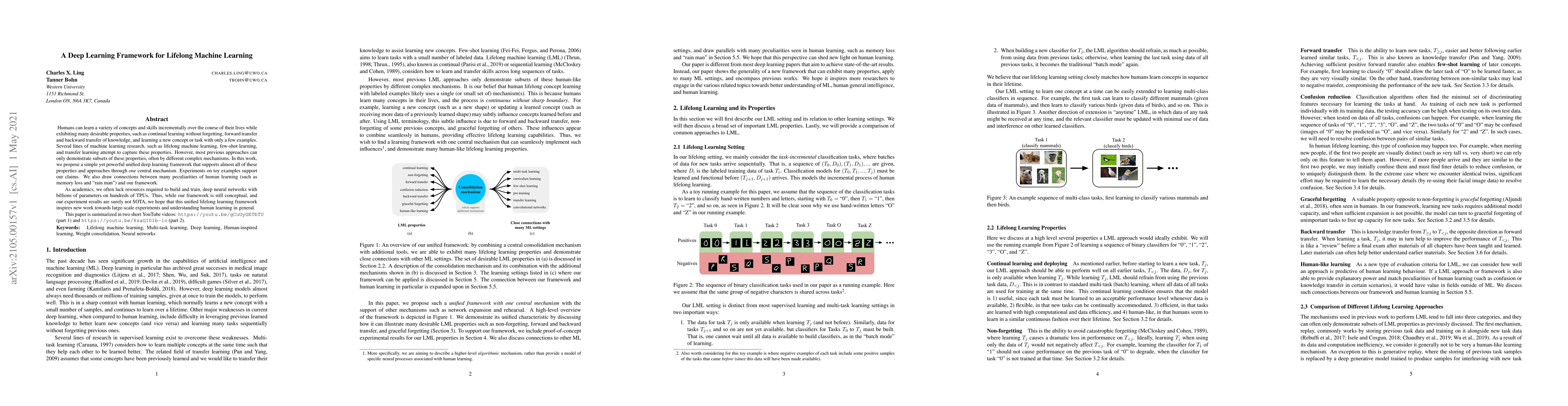 This paper proposes a unified deep learning framework for lifelong machine learning, aiming to capture human-like learning properties such as continual learning without forgetting and transfer learning through a single mechanism. While the framework is conceptual and experimental results are preliminary, it seeks to inspire future research towards large-scale experiments and a deeper understanding of human learning.