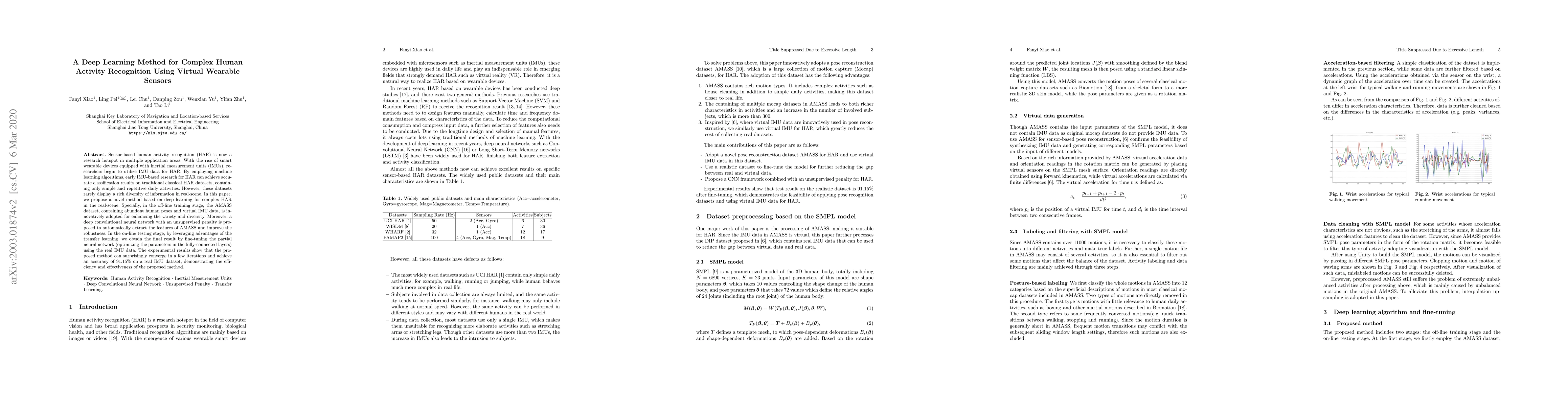 Sensor-based human activity recognition (HAR) is now a research hotspot in multiple application areas. With the rise of smart wearable devices equipped with inertial measurement units (IMUs), researchers begin to utilize IMU data for HAR. By employing machine learning algorithms, early IMU-based research for HAR can achieve accurate classification results on traditional classical HAR datasets, containing only simple and repetitive daily activities. However, these datasets rarely display a rich diversity of information in real-scene. In this paper, we propose a novel method based on deep learning for complex HAR in the real-scene. Specially, in the off-line training stage, the AMASS dataset, containing abundant human poses and virtual IMU data, is innovatively adopted for enhancing the variety and diversity. Moreover, a deep convolutional neural network with an unsupervised penalty is proposed to automatically extract the features of AMASS and improve the robustness. In the on-line testing stage, by leveraging advantages of the transfer learning, we obtain the final result by fine-tuning the partial neural network (optimizing the parameters in the fully-connected layers) using the real IMU data. The experimental results show that the proposed method can surprisingly converge in a few iterations and achieve an accuracy of 91.15% on a real IMU dataset, demonstrating the efficiency and effectiveness of the proposed method.