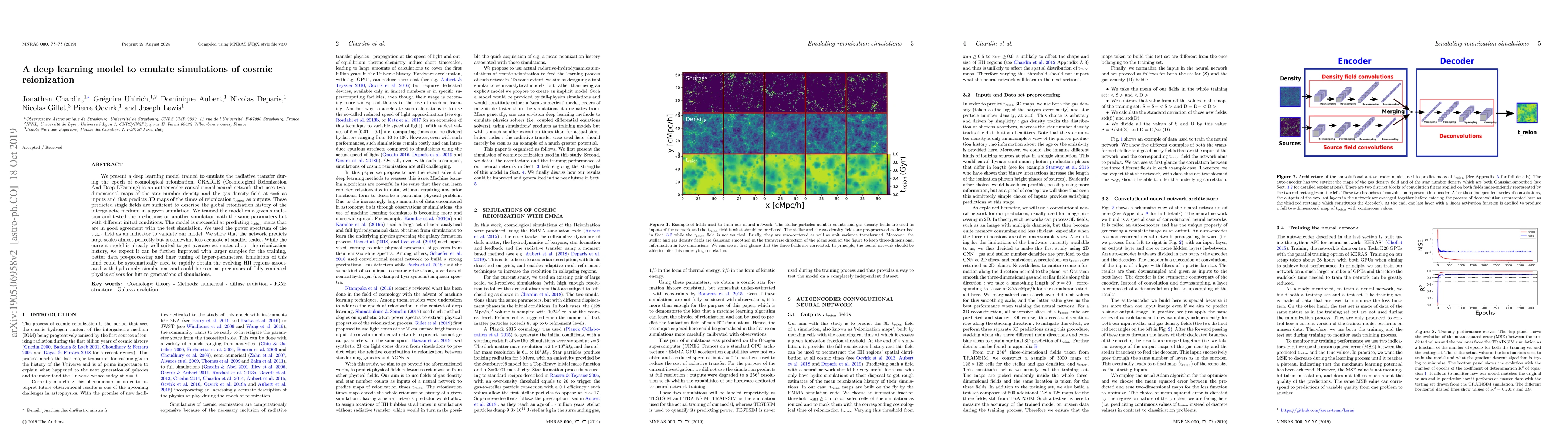 We present a deep learning model trained to emulate the radiative transfer during the epoch of cosmological reionization. CRADLE (Cosmological Reionization And Deep LEarning) is an autoencoder convolutional neural network that uses two-dimensional maps of the star number density and the gas density field at z=6 as inputs and that predicts 3D maps of the times of reionization $\mathrm{t_{reion}}$ as outputs. These predicted single fields are sufficient to describe the global reionization history of the intergalactic medium in a given simulation. We trained the model on a given simulation and tested the predictions on another simulation with the same paramaters but with different initial conditions. The model is successful at predicting $\mathrm{t_{reion}}$ maps that are in good agreement with the test simulation. We used the power spectrum of the $\mathrm{t_{reion}}$ field as an indicator to validate our model. We show that the network predicts large scales almost perfectly but is somewhat less accurate at smaller scales. While the current model is already well-suited to get average estimates about the reionization history, we expect it can be further improved with larger samples for the training, better data pre-processing and finer tuning of hyper-parameters. Emulators of this kind could be systematically used to rapidly obtain the evolving HII regions associated with hydro-only simulations and could be seen as precursors of fully emulated physics solvers for future generations of simulations.