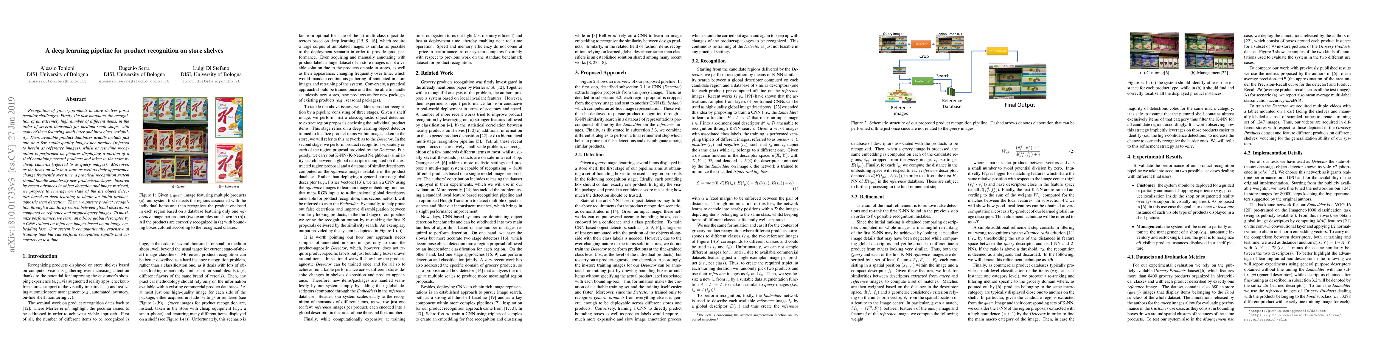 Recognition of grocery products in store shelves poses peculiar challenges. Firstly, the task mandates the recognition of an extremely high number of different items, in the order of several thousands for medium-small shops, with many of them featuring small inter and intra class variability. Then, available product databases usually include just one or a few studio-quality images per product (referred to herein as reference images), whilst at test time recognition is performed on pictures displaying a portion of a shelf containing several products and taken in the store by cheap cameras (referred to as query images). Moreover, as the items on sale in a store as well as their appearance change frequently over time, a practical recognition system should handle seamlessly new products/packages. Inspired by recent advances in object detection and image retrieval, we propose to leverage on state of the art object detectors based on deep learning to obtain an initial productagnostic item detection. Then, we pursue product recognition through a similarity search between global descriptors computed on reference and cropped query images. To maximize performance, we learn an ad-hoc global descriptor by a CNN trained on reference images based on an image embedding loss. Our system is computationally expensive at training time but can perform recognition rapidly and accurately at test time.