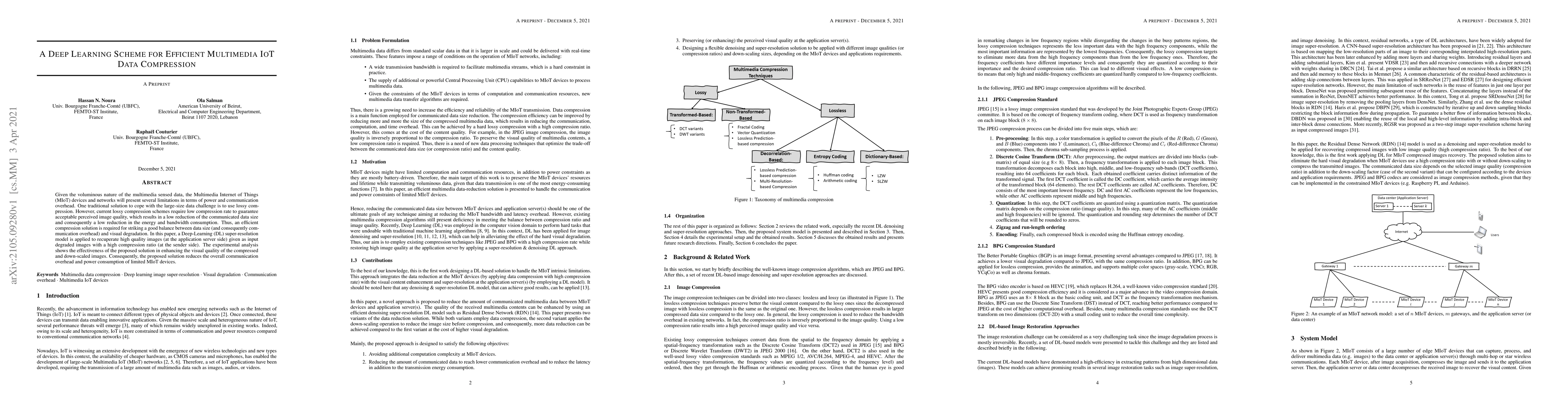 This paper proposes a deep learning scheme to efficiently compress multimedia data for IoT devices, reducing communication overhead and power consumption while maintaining acceptable image quality.