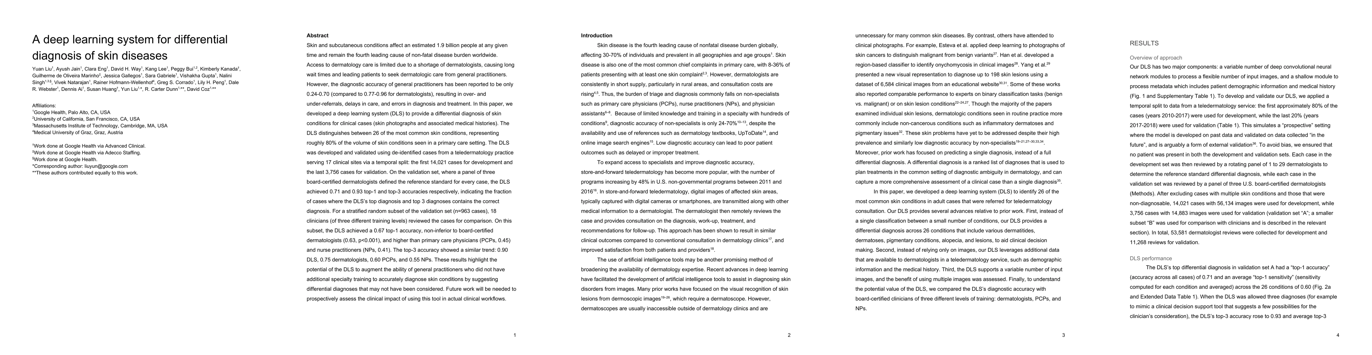 This paper introduces a deep learning system (DLS) that diagnoses 26 common skin conditions, achieving high accuracy comparable to dermatologists and superior to general practitioners. The DLS shows potential to improve skin condition diagnosis in primary care settings.