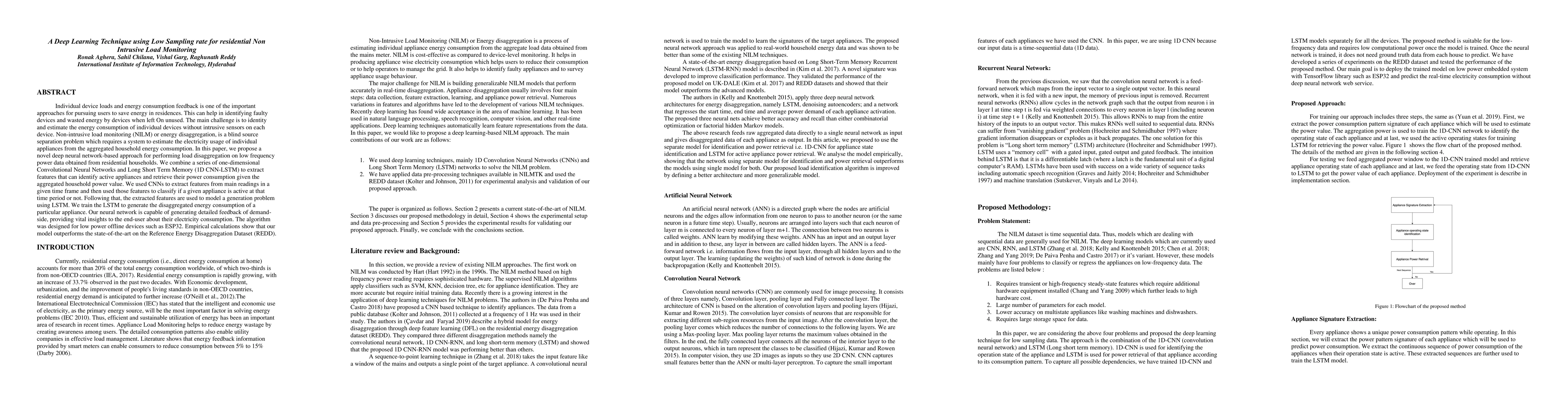 This paper proposes a novel deep learning technique using a 1D CNN-LSTM network for non-intrusive load monitoring in residential settings, utilizing low sampling rate power data. The model effectively identifies and estimates individual appliance energy consumption without intrusive sensors, outperforming state-of-the-art methods on the REDD dataset.