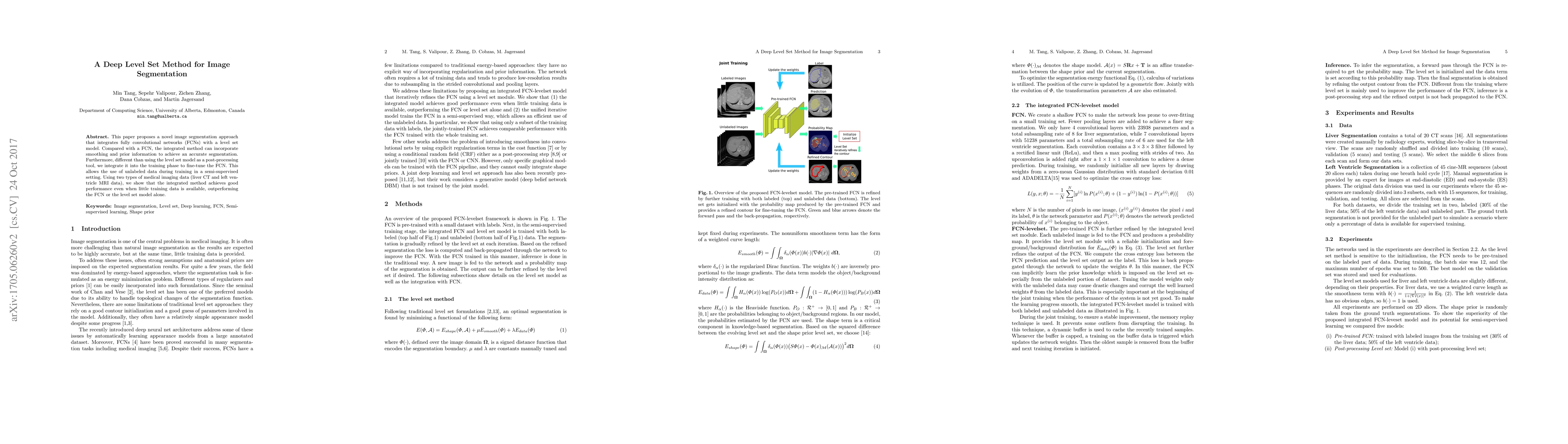 This paper proposes a novel image segmentation approach combining fully convolutional networks with level set models to improve accuracy with smoothing and prior information, achieving good performance even with limited training data.