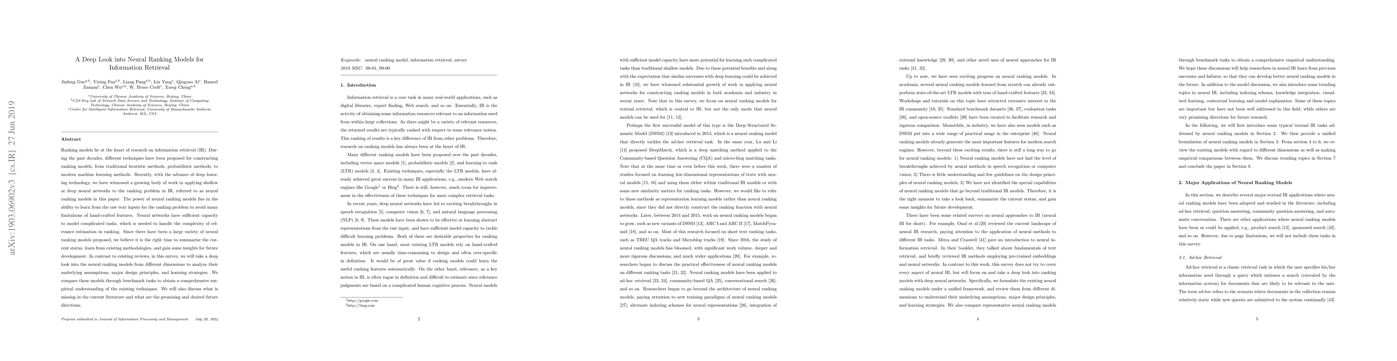 Ranking models lie at the heart of research on information retrieval (IR). During the past decades, different techniques have been proposed for constructing ranking models, from traditional heuristic methods, probabilistic methods, to modern machine learning methods. Recently, with the advance of deep learning technology, we have witnessed a growing body of work in applying shallow or deep neural networks to the ranking problem in IR, referred to as neural ranking models in this paper. The power of neural ranking models lies in the ability to learn from the raw text inputs for the ranking problem to avoid many limitations of hand-crafted features. Neural networks have sufficient capacity to model complicated tasks, which is needed to handle the complexity of relevance estimation in ranking. Since there have been a large variety of neural ranking models proposed, we believe it is the right time to summarize the current status, learn from existing methodologies, and gain some insights for future development. In contrast to existing reviews, in this survey, we will take a deep look into the neural ranking models from different dimensions to analyze their underlying assumptions, major design principles, and learning strategies. We compare these models through benchmark tasks to obtain a comprehensive empirical understanding of the existing techniques. We will also discuss what is missing in the current literature and what are the promising and desired future directions.