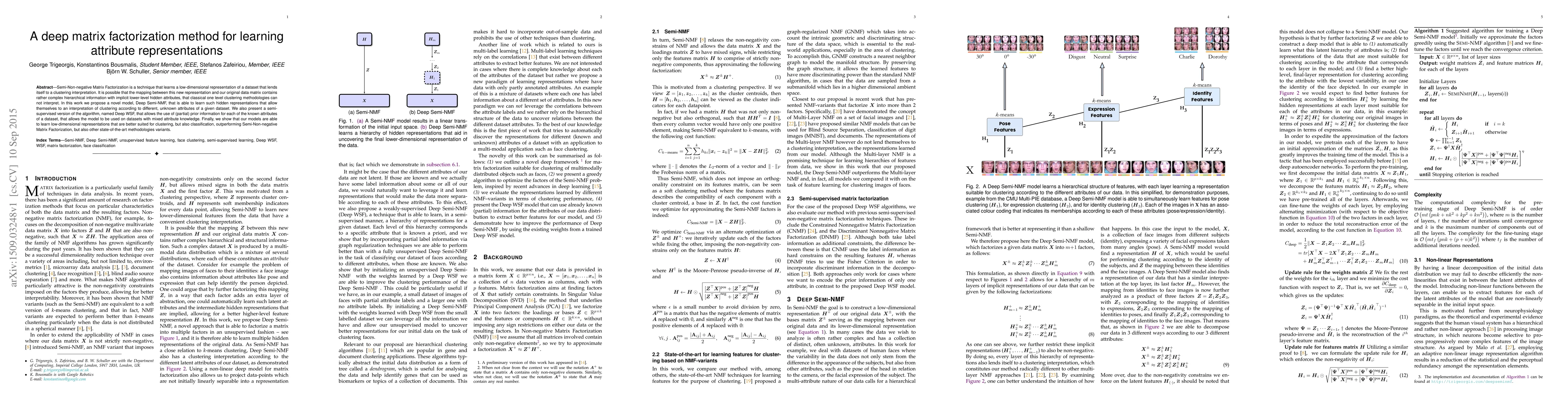 Semi-Non-negative Matrix Factorization is a technique that learns a low-dimensional representation of a dataset that lends itself to a clustering interpretation. It is possible that the mapping between this new representation and our original data matrix contains rather complex hierarchical information with implicit lower-level hidden attributes, that classical one level clustering methodologies can not interpret. In this work we propose a novel model, Deep Semi-NMF, that is able to learn such hidden representations that allow themselves to an interpretation of clustering according to different, unknown attributes of a given dataset. We also present a semi-supervised version of the algorithm, named Deep WSF, that allows the use of (partial) prior information for each of the known attributes of a dataset, that allows the model to be used on datasets with mixed attribute knowledge. Finally, we show that our models are able to learn low-dimensional representations that are better suited for clustering, but also classification, outperforming Semi-Non-negative Matrix Factorization, but also other state-of-the-art methodologies variants.