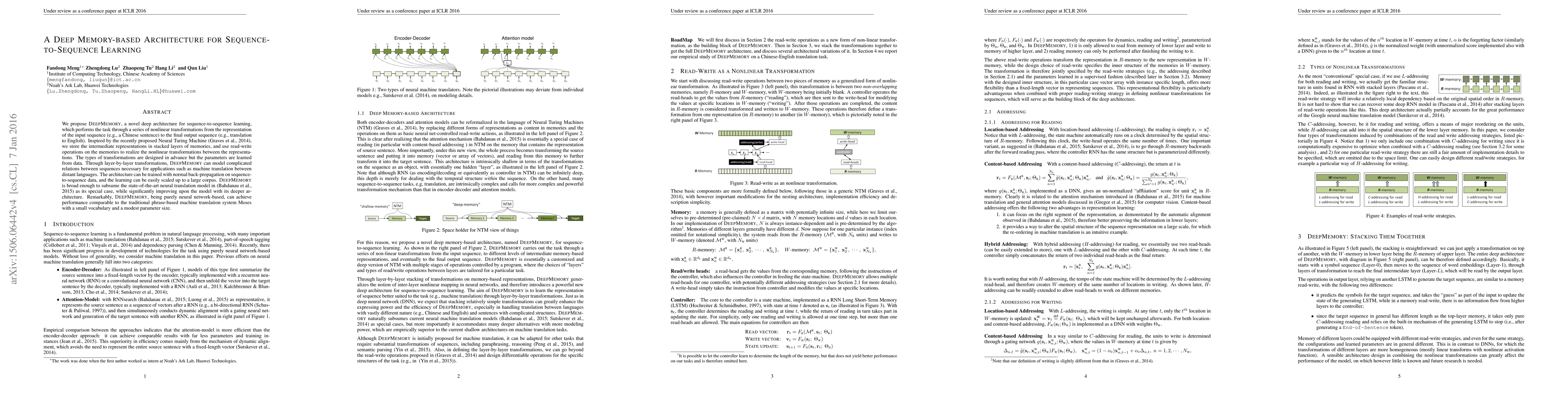 We propose DEEPMEMORY, a novel deep architecture for sequence-to-sequence learning, which performs the task through a series of nonlinear transformations from the representation of the input sequence (e.g., a Chinese sentence) to the final output sequence (e.g., translation to English). Inspired by the recently proposed Neural Turing Machine (Graves et al., 2014), we store the intermediate representations in stacked layers of memories, and use read-write operations on the memories to realize the nonlinear transformations between the representations. The types of transformations are designed in advance but the parameters are learned from data. Through layer-by-layer transformations, DEEPMEMORY can model complicated relations between sequences necessary for applications such as machine translation between distant languages. The architecture can be trained with normal back-propagation on sequenceto-sequence data, and the learning can be easily scaled up to a large corpus. DEEPMEMORY is broad enough to subsume the state-of-the-art neural translation model in (Bahdanau et al., 2015) as its special case, while significantly improving upon the model with its deeper architecture. Remarkably, DEEPMEMORY, being purely neural network-based, can achieve performance comparable to the traditional phrase-based machine translation system Moses with a small vocabulary and a modest parameter size.