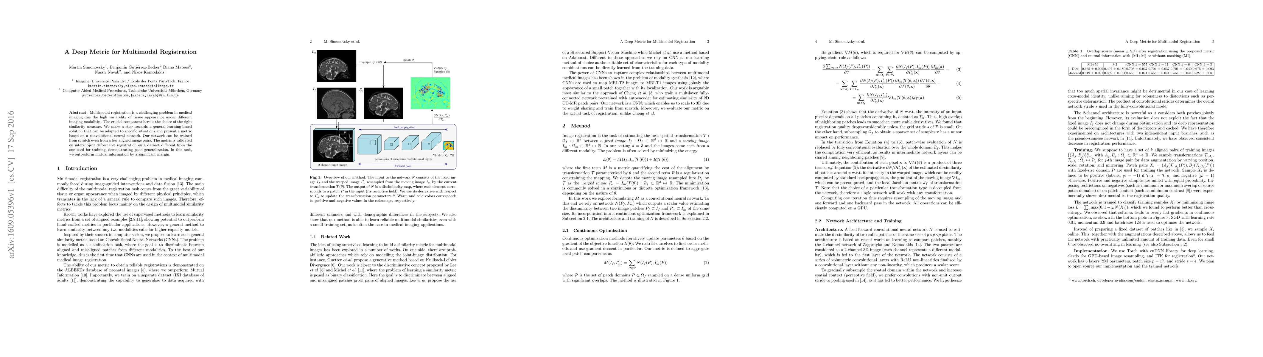 Multimodal registration is a challenging problem in medical imaging due the high variability of tissue appearance under different imaging modalities. The crucial component here is the choice of the right similarity measure. We make a step towards a general learning-based solution that can be adapted to specific situations and present a metric based on a convolutional neural network. Our network can be trained from scratch even from a few aligned image pairs. The metric is validated on intersubject deformable registration on a dataset different from the one used for training, demonstrating good generalization. In this task, we outperform mutual information by a significant margin.