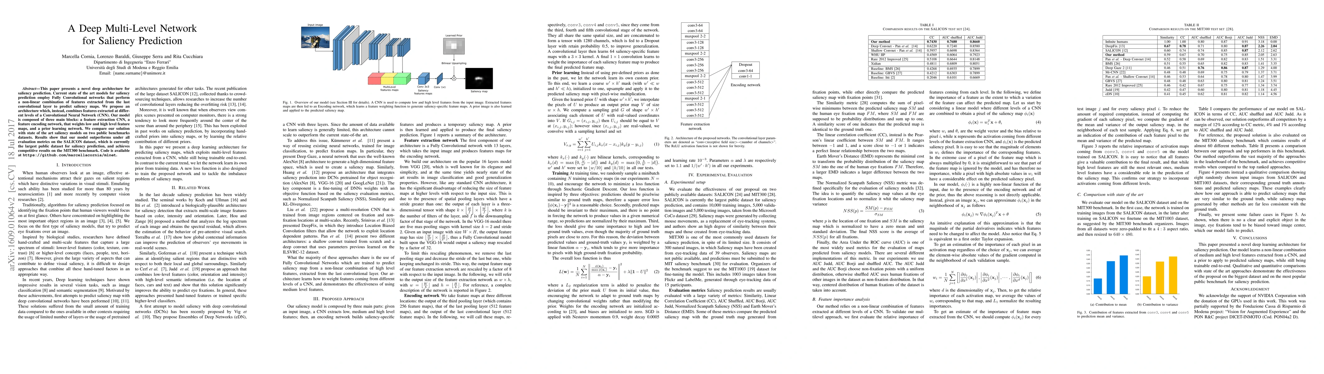 This paper introduces a novel deep multi-level network for saliency prediction that combines features from different levels of a CNN, outperforming current state-of-the-art models on the SALICON dataset and achieving competitive results on the MIT300 benchmark. The proposed architecture includes a feature extraction CNN, a feature encoding network, and a prior learning network.