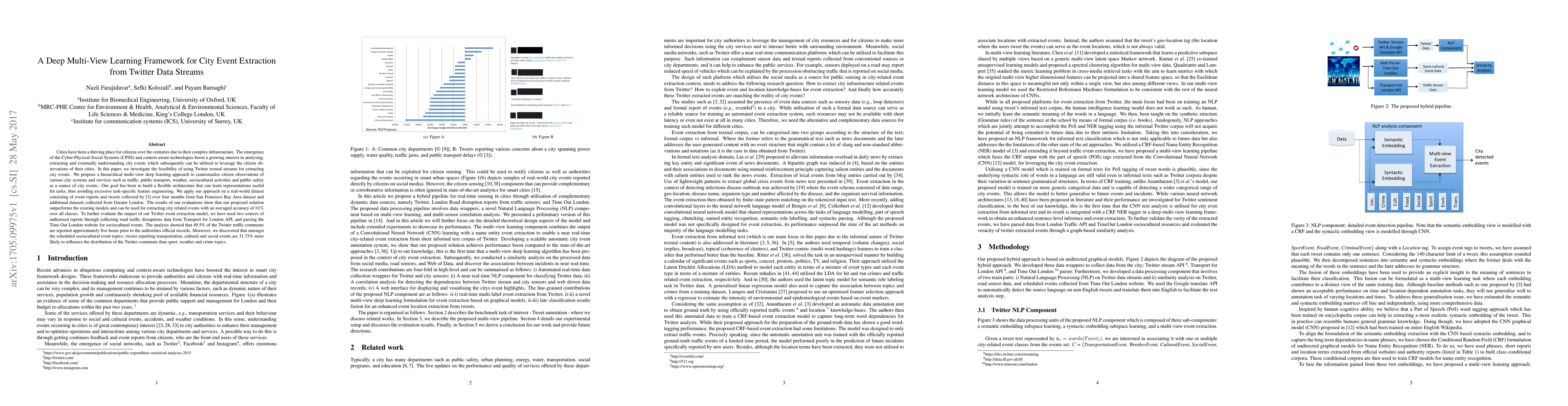 Cities have been a thriving place for citizens over the centuries due to their complex infrastructure. The emergence of the Cyber-Physical-Social Systems (CPSS) and context-aware technologies boost a growing interest in analysing, extracting and eventually understanding city events which subsequently can be utilised to leverage the citizen observations of their cities. In this paper, we investigate the feasibility of using Twitter textual streams for extracting city events. We propose a hierarchical multi-view deep learning approach to contextualise citizen observations of various city systems and services. Our goal has been to build a flexible architecture that can learn representations useful for tasks, thus avoiding excessive task-specific feature engineering. We apply our approach on a real-world dataset consisting of event reports and tweets of over four months from San Francisco Bay Area dataset and additional datasets collected from London. The results of our evaluations show that our proposed solution outperforms the existing models and can be used for extracting city related events with an averaged accuracy of 81% over all classes. To further evaluate the impact of our Twitter event extraction model, we have used two sources of authorised reports through collecting road traffic disruptions data from Transport for London API, and parsing the Time Out London website for sociocultural events. The analysis showed that 49.5% of the Twitter traffic comments are reported approximately five hours prior to the authorities official records. Moreover, we discovered that amongst the scheduled sociocultural event topics; tweets reporting transportation, cultural and social events are 31.75% more likely to influence the distribution of the Twitter comments than sport, weather and crime topics.