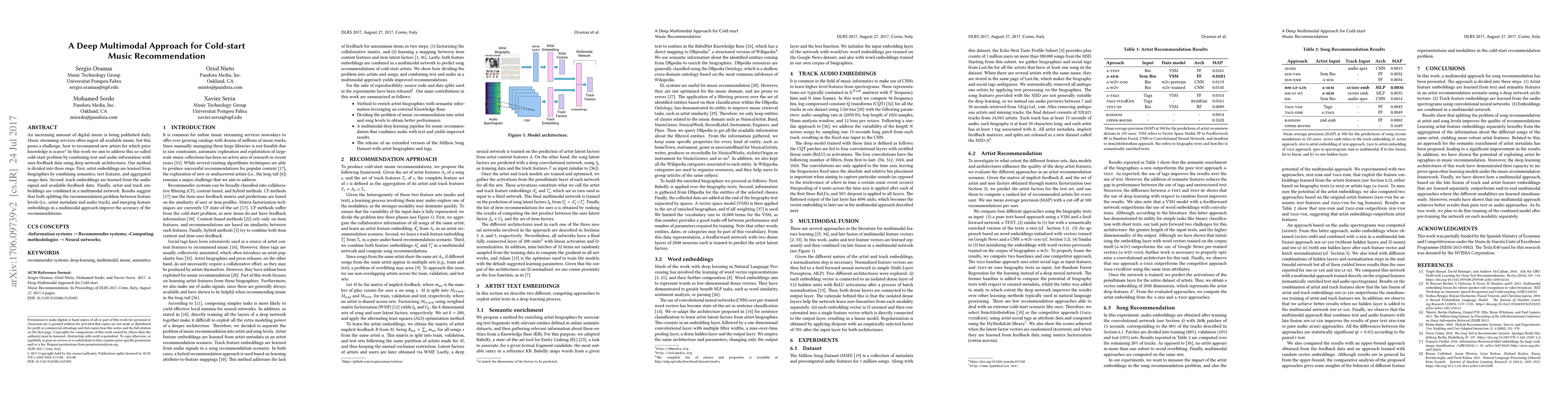 This paper proposes a deep multimodal approach to tackle the cold-start problem in music recommendation by integrating text and audio information with user feedback data. The method combines artist embeddings from biographies and track embeddings from audio signals to enhance recommendation accuracy.