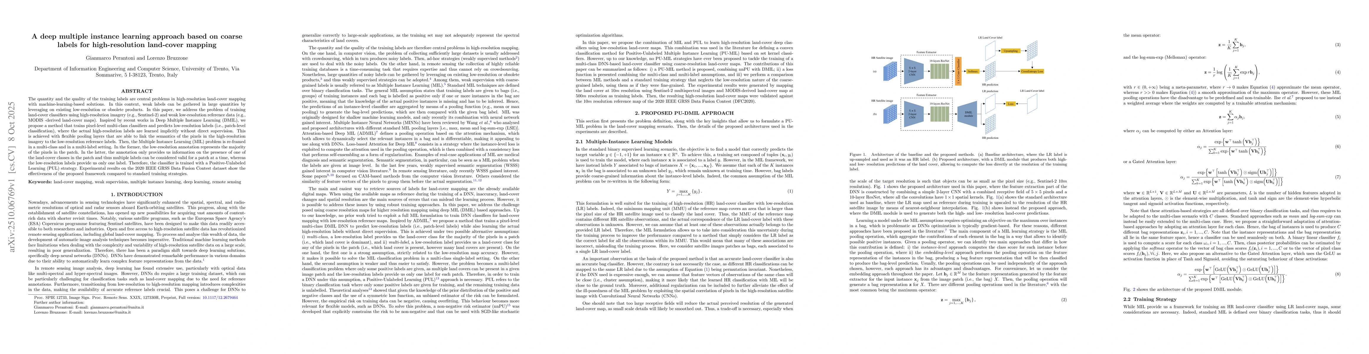 The quantity and the quality of the training labels are central problems in high-resolution land-cover mapping with machine-learning-based solutions. In this context, weak labels can be gathered in large quantities by leveraging on existing low-resolution or obsolete products. In this paper, we address the problem of training land-cover classifiers using high-resolution imagery (e.g., Sentinel-2) and weak low-resolution reference data (e.g., MODIS -derived land-cover maps). Inspired by recent works in Deep Multiple Instance Learning (DMIL), we propose a method that trains pixel-level multi-class classifiers and predicts low-resolution labels (i.e., patch-level classification), where the actual high-resolution labels are learned implicitly without direct supervision. This is achieved with flexible pooling layers that are able to link the semantics of the pixels in the high-resolution imagery to the low-resolution reference labels. Then, the Multiple Instance Learning (MIL) problem is re-framed in a multi-class and in a multi-label setting. In the former, the low-resolution annotation represents the majority of the pixels in the patch. In the latter, the annotation only provides us information on the presence of one of the land-cover classes in the patch and thus multiple labels can be considered valid for a patch at a time, whereas the low-resolution labels provide us only one label. Therefore, the classifier is trained with a Positive-Unlabeled Learning (PUL) strategy. Experimental results on the 2020 IEEE GRSS Data Fusion Contest dataset show the effectiveness of the proposed framework compared to standard training strategies.