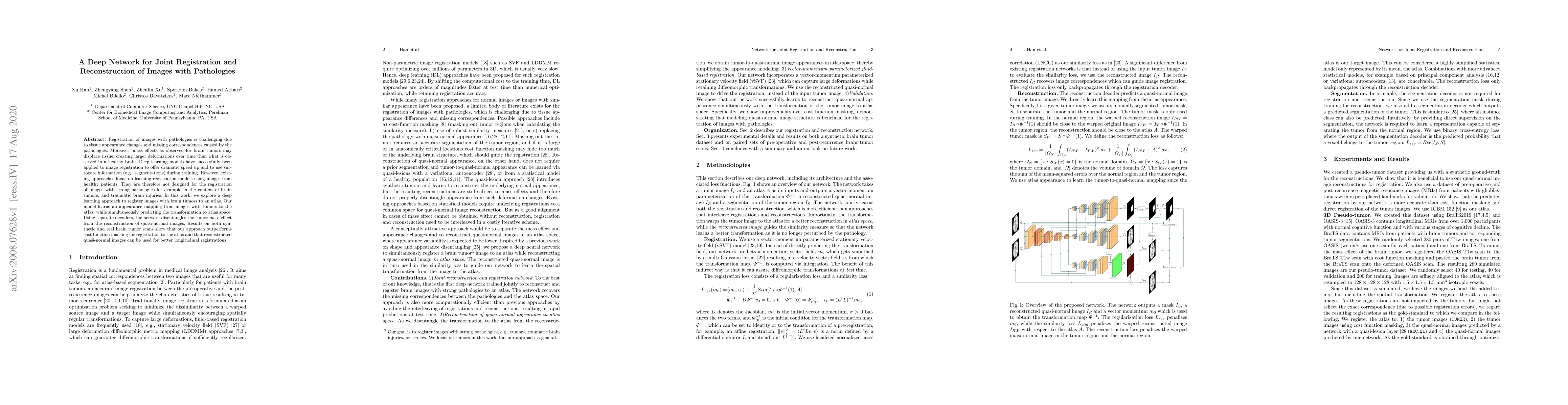 This paper proposes a deep learning model for registering and reconstructing images with brain pathologies, specifically targeting brain tumors. The approach disentangles tumor mass effects from normal tissue reconstruction, achieving better registration accuracy and reconstructed images compared to traditional methods.