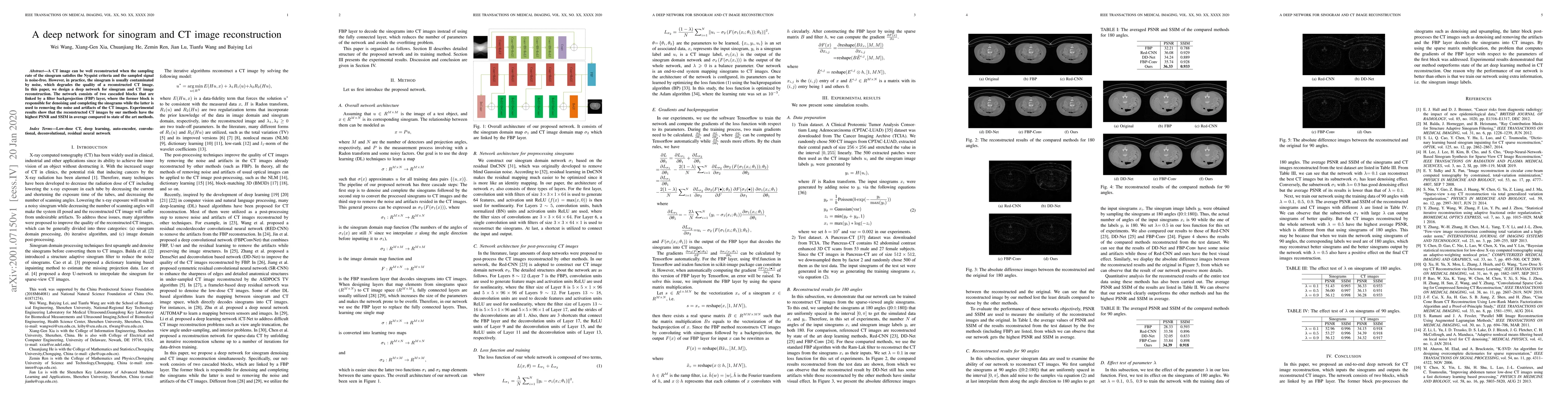 This paper proposes a deep network for sinogram and CT image reconstruction that addresses noise degradation. The network features two cascaded blocks, one for sinogram denoising and completion, and another for CT image noise and artifact removal, linked by a filter backprojection layer. Experimental results demonstrate superior reconstruction quality with higher PSNR and SSIM compared to existing methods.