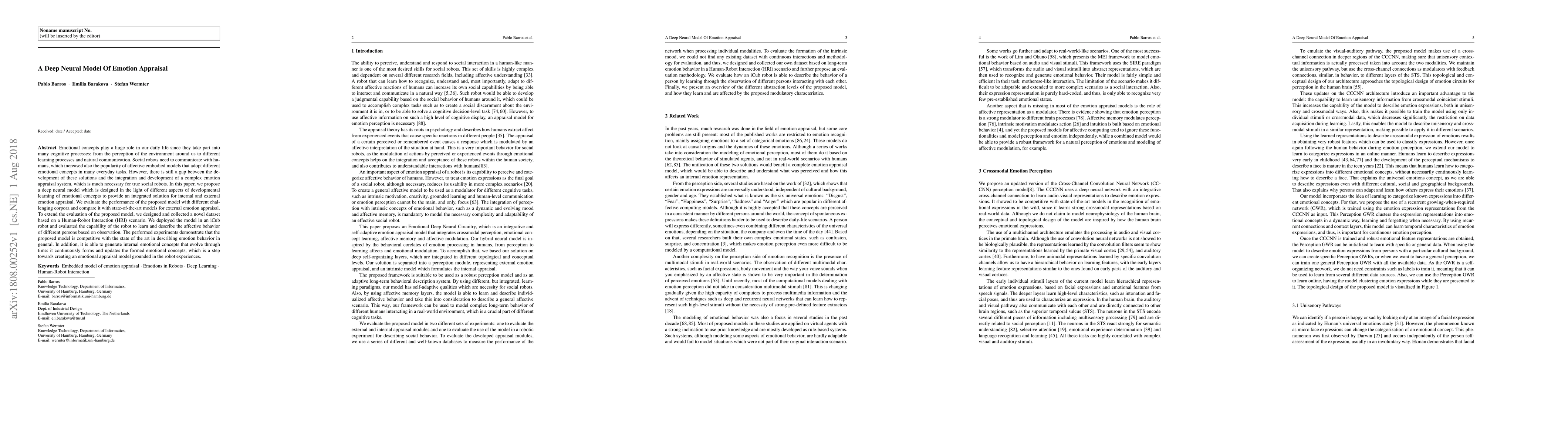 This paper introduces a deep neural model designed for integrated internal and external emotion appraisal, crucial for social robots. The model is evaluated against state-of-the-art methods and tested in a Human-Robot Interaction scenario, showing competitive performance and the ability to evolve emotional concepts over time.
