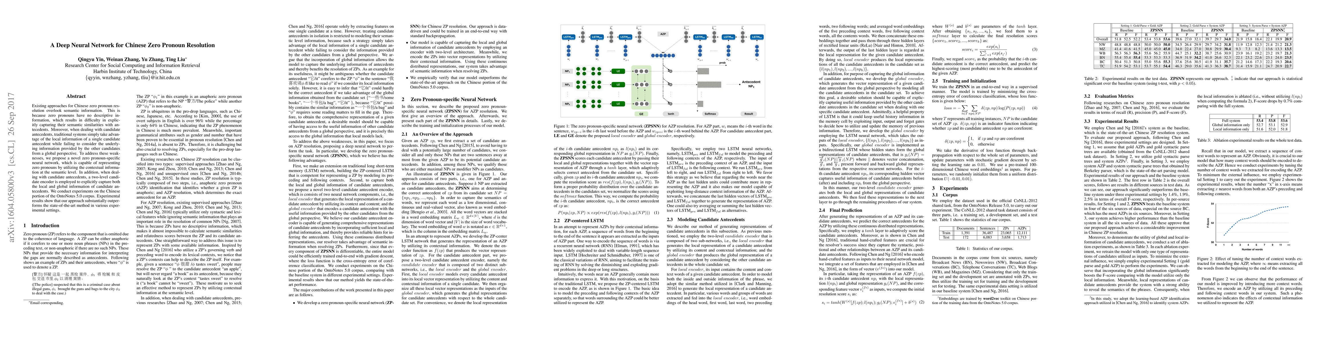 This paper proposes a deep neural network to resolve Chinese zero pronouns by leveraging contextual semantic information and employing a two-level candidate encoder for local and global antecedent analysis. Experimental results demonstrate significant improvements over existing methods on the Chinese OntoNotes 5.0 corpus.