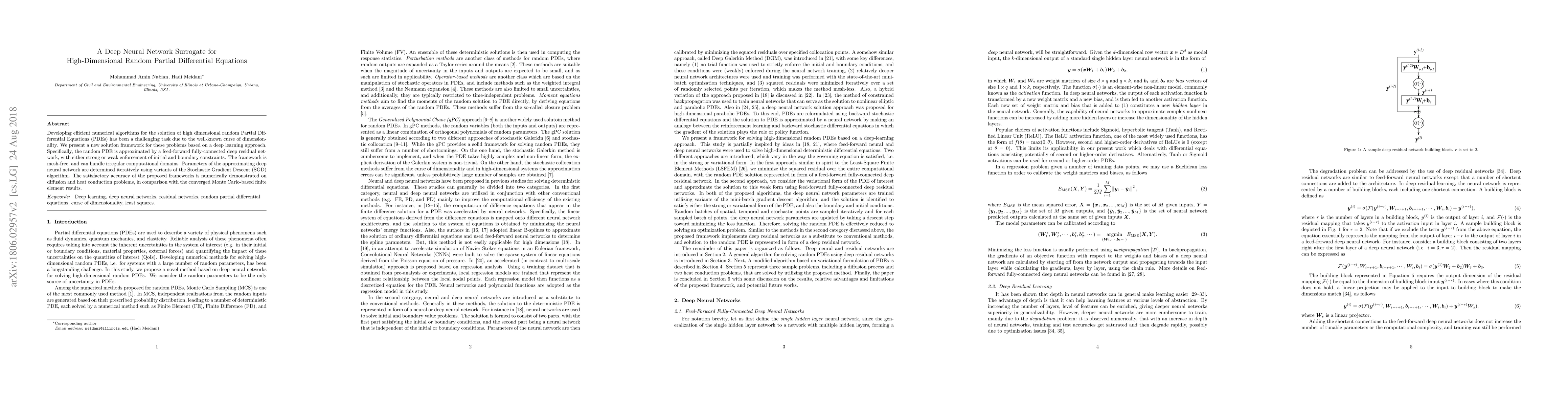 This paper proposes a deep neural network surrogate for solving high-dimensional random partial differential equations (PDEs) using a feed-forward deep residual network. The method is mesh-free and iteratively trained using Stochastic Gradient Descent, demonstrating satisfactory accuracy on diffusion and heat conduction problems compared to Monte Carlo-based finite element results.