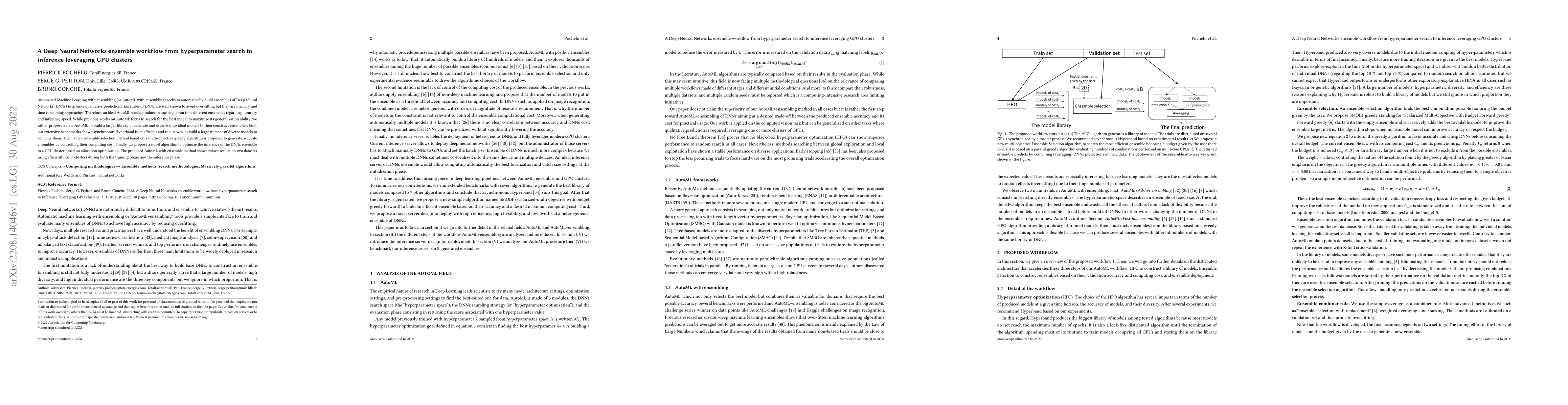 This paper proposes an AutoML workflow for building ensembles of Deep Neural Networks using asynchronous Hyperband for efficient hyperparameter search, a multi-objective greedy algorithm for ensemble selection, and an optimization algorithm for GPU cluster inference to balance accuracy and computational cost. The method is shown to be effective on two datasets.